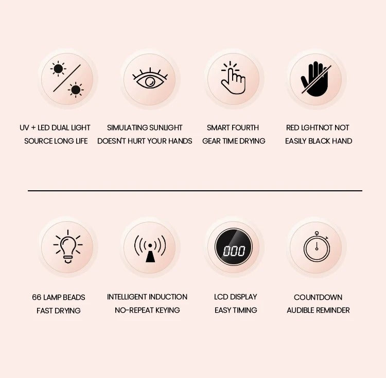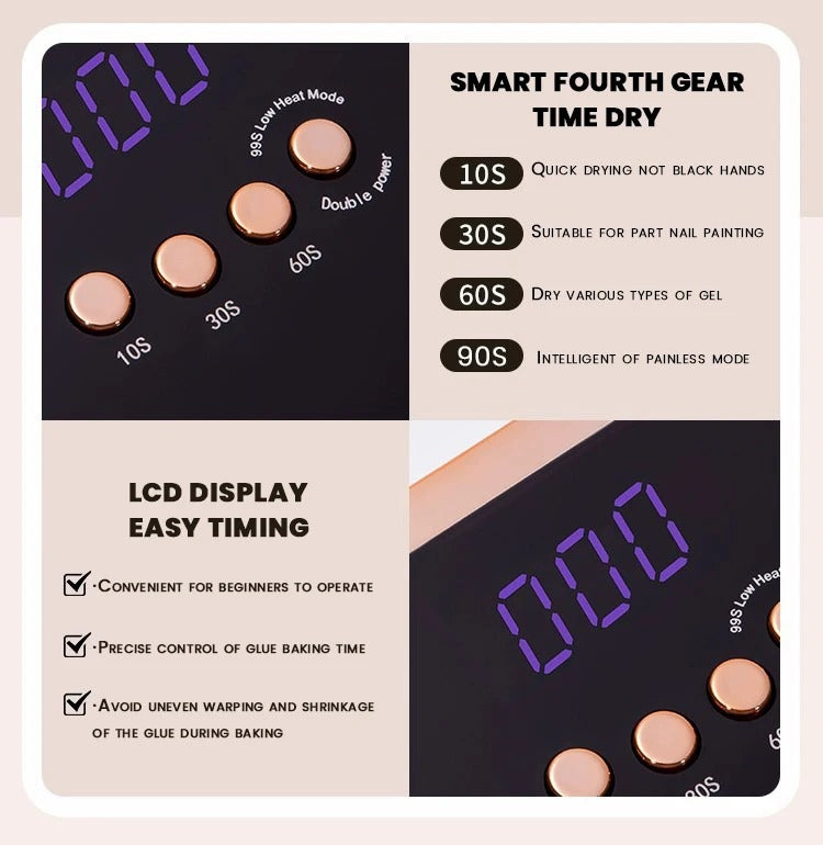 - Enjoy a professional manicure experience with this 4 time mode device featuring a large LCD screen. Choose from 10s fastest mode to 99s low heat mode to cover all your nail needs. The large screen displays the remaining time, giving you a clear idea of how long your nails have been drying to avoid any mess. Plus, it comes with a portable handle and detachable base for easy storage.
