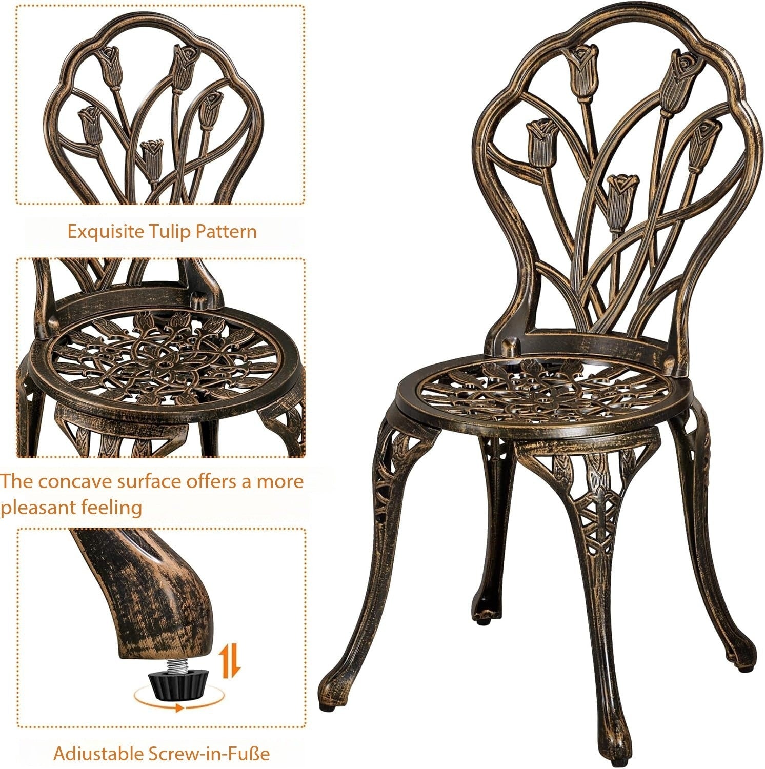 Antique Appearance with Floral Pattern: The intricate floral pattern on the backrest and tabletop adds a touch of elegance to your outdoor space. The antique bronze finish not only enhances its aesthetic appeal but also ensures it blends harmoniously with your existing decor.