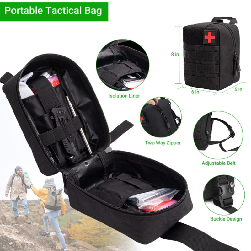 To keep your kit small and portable enough so you can carry it at all times. 232 PCS items are stored in this dual zippers and interior storage design bag. You can attach it to a compatible backpack or combat vest or belt by using its back attachment straps or removal velcro panel. Great gift idea for people who love hunting, hiking, car travel, camping and wilderness adventure.