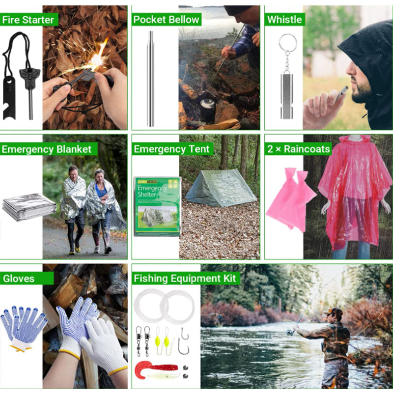This emergency survival kit including various practical survival tools and essentials to survive in the wilderness or disasters. 14-in-1 multi-function axe, folding shovel, folding saber, tent, flashlight, fire starter. A folding knife and steel wire saw for cutting wood or bone, 4-in-1 survival whistle, compass, and thermal blanket for retaining 90% of body heat.