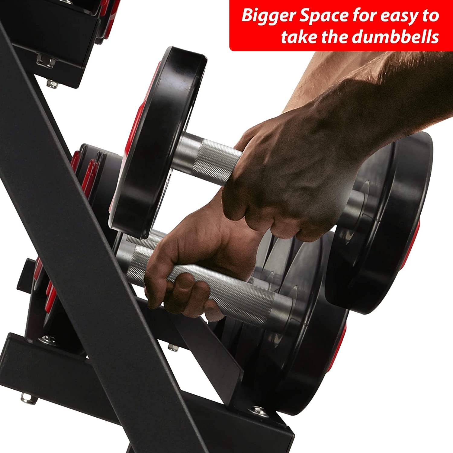 -Multi-Tier Dumbbell Storage: Store your dumbbells in a designated space that you can easily access while keeping things organized in your home gym. The dumbbell rack is easy to assemble and designed to fit most size dumbbells.