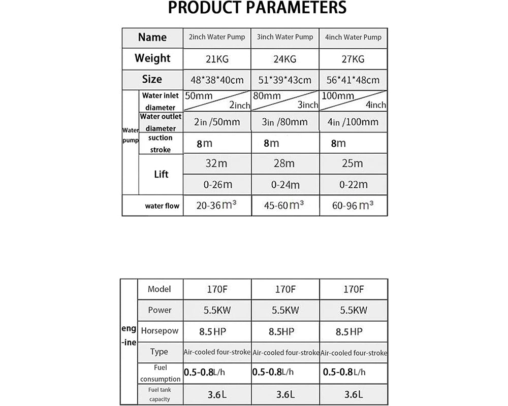 - Large Fuel Capacity & Efficiency: 3.6L fuel tank with 0.5–0.8L/h consumption for long hours of operation with this 4-Stroke Pump.