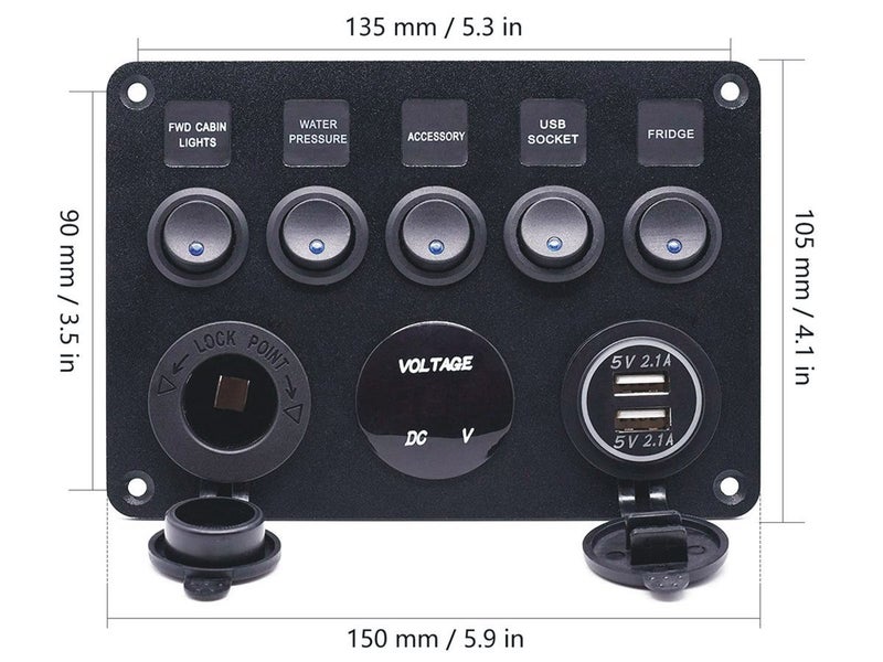 Take full control of your vehicle's electronics with this all-in-one rocker switch panel. Designed for cars, boats, trucks, and RVs, this versatile rocker switch panel features five illuminated ON/OFF switches, dual USB charging ports, and a digital voltmeter. With waterproof and corrosion-resistant construction, this rocker switch panel is built to perform in harsh environments on land or water.