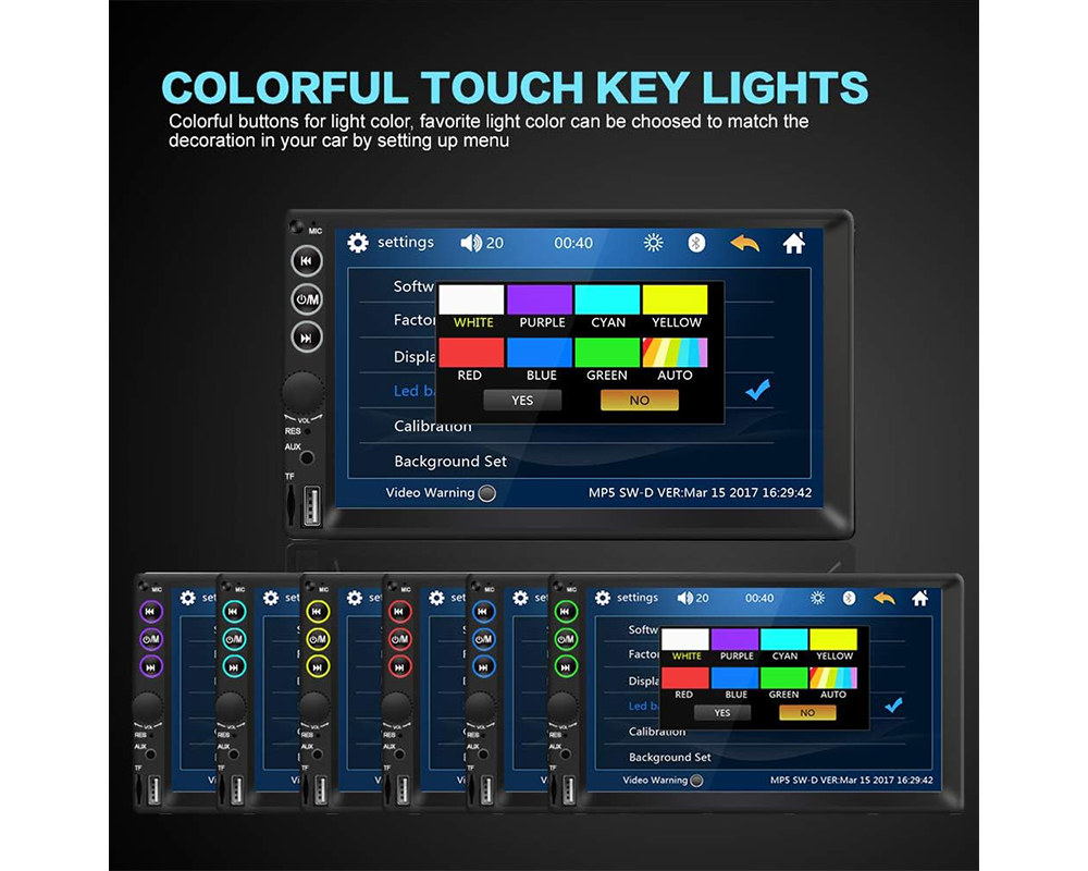 Designed for powerful sound, this 2DIN car stereo delivers up to 4 × 45W output with multiple EQ modes, providing rich and balanced audio. The 7 inch touch screen car stereo supports USB, TF card, and AUX input, making this multimedia car stereo highly compatible with various media sources.