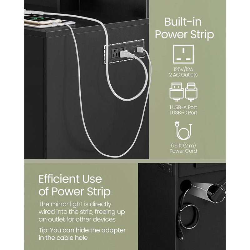 - Convenient Power Hub: A built-in power strip with 2 outlets, 1 USB-A, and 1 USB-C port makes it easy to power your hair tools and charge devices. The mirror's light is cleverly wired into the power strip, keeping your outlets free for other appliances.