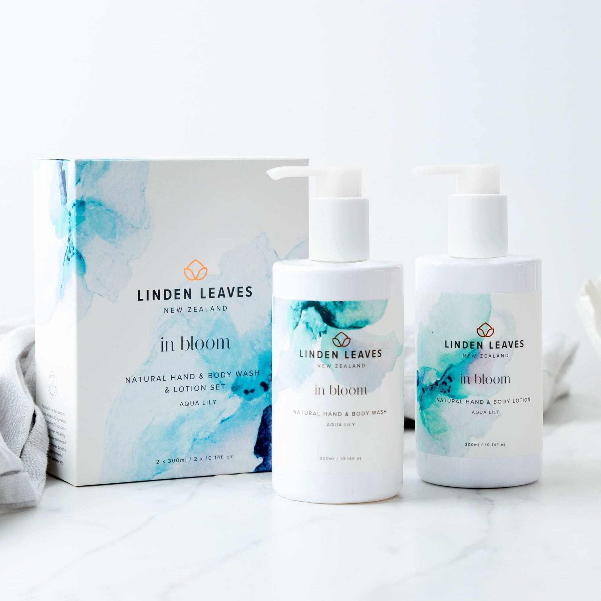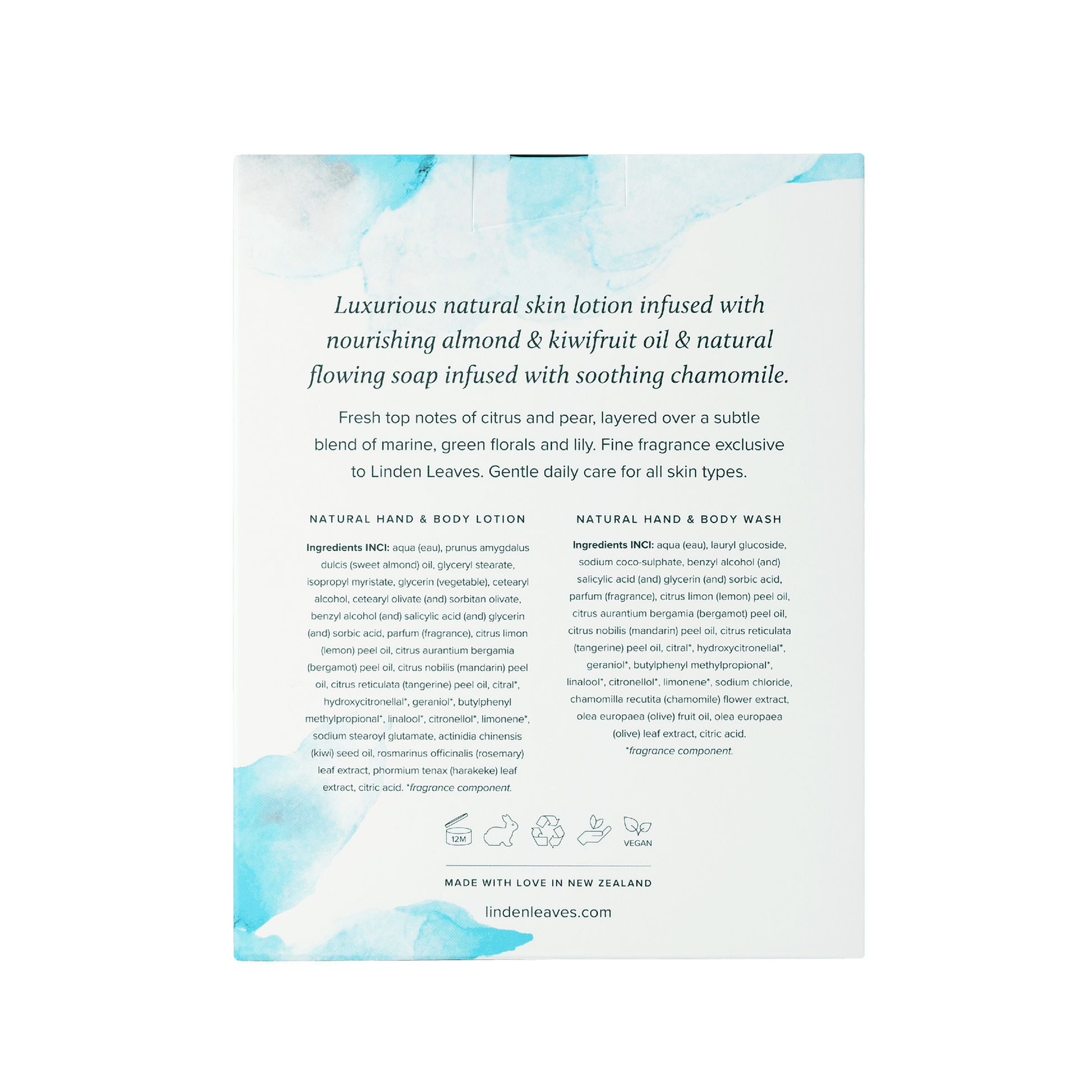 A hand and body wash and lotion set for daily cleansing and care. Fragranced in uplifting Aqua Lily with top notes of citrus and pear, layered over a soft bouquet of green florals and lily. Cleanse and protect your hands and body with this natural and nourishing duo. Completely free from parabens, mineral oil and sodium lauryl sulphate. Ideal for daily use for the whole family. Made in New Zealand.