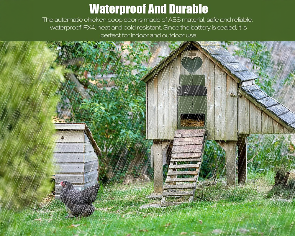 - Durable & Weatherproof: Made of aluminium and ABS, the Chicken Coop Door is IPX4 waterproof, heat-resistant, and cold-resistant.