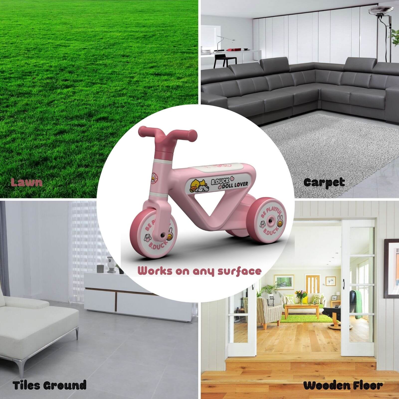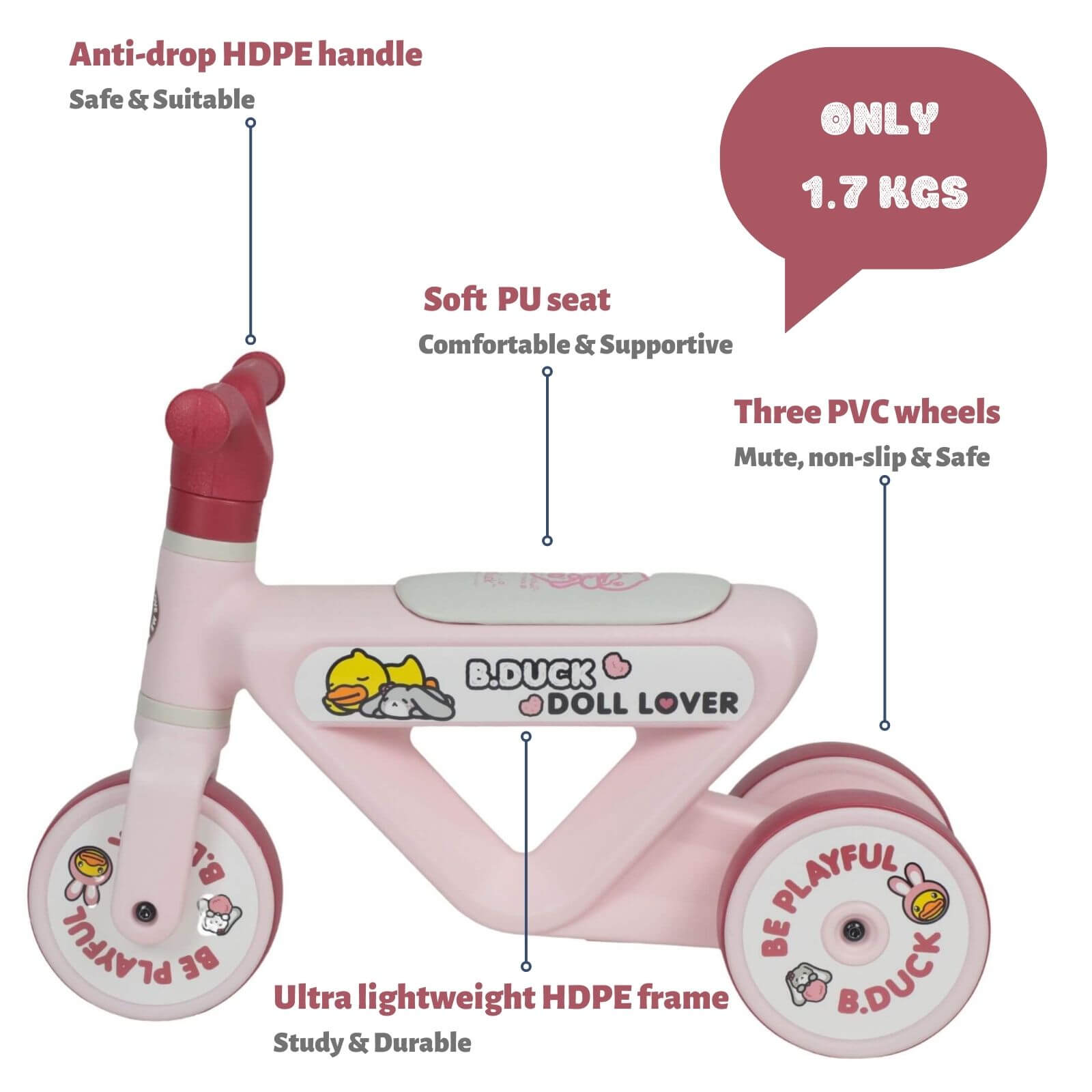 Luddy 1005S Pink is a safe toddler starter balance bike with 3 wheels for babies aged 18-36 months who are learning to walk or developing their balance.