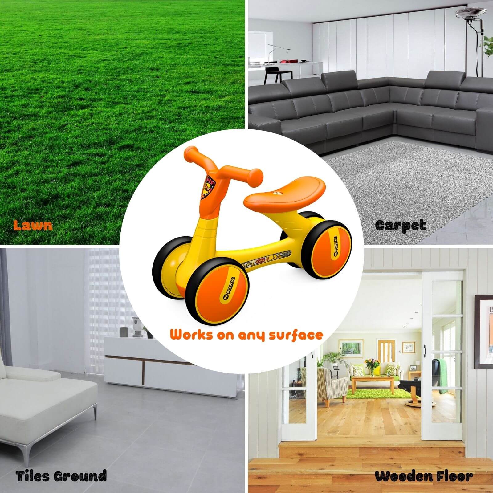 Luddy 1006BD Yellow is a safe toddler starter balance bike with 4 wheels for babies aged 18-36 months who are learning to walk or developing their balance.