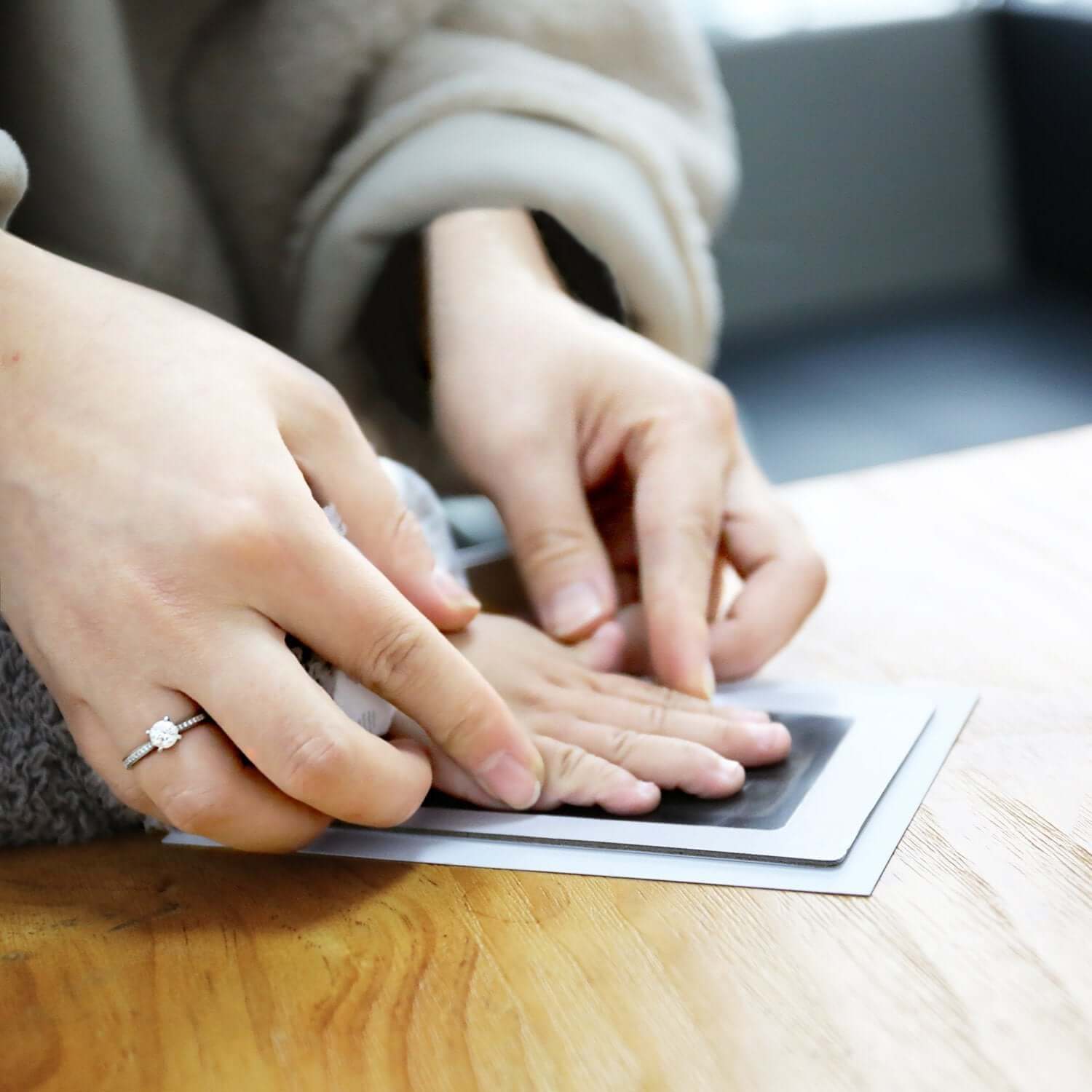 - Remove the baby’s hands or feet and lift the ink pad to reveal the baby’s mark on the surface.