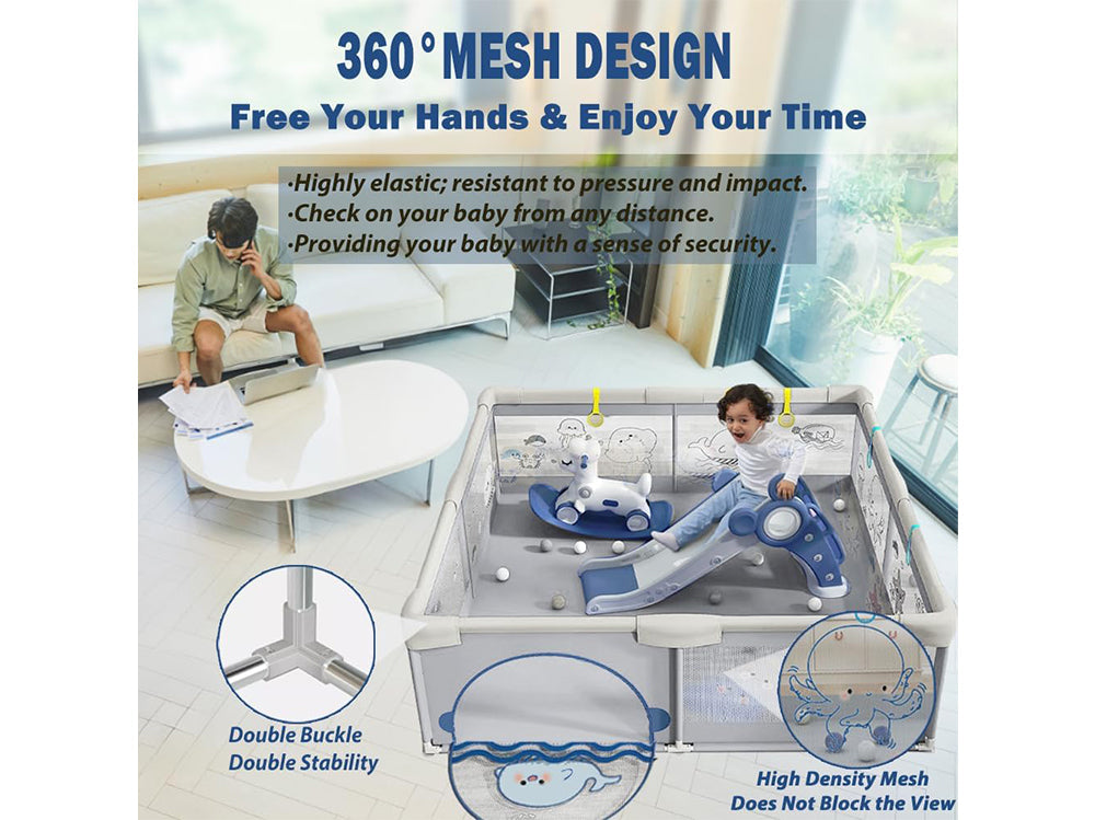 - Breathable Mesh Design: Allows airflow and visibility on all four sides so you can easily monitor your child while using the baby playpen.