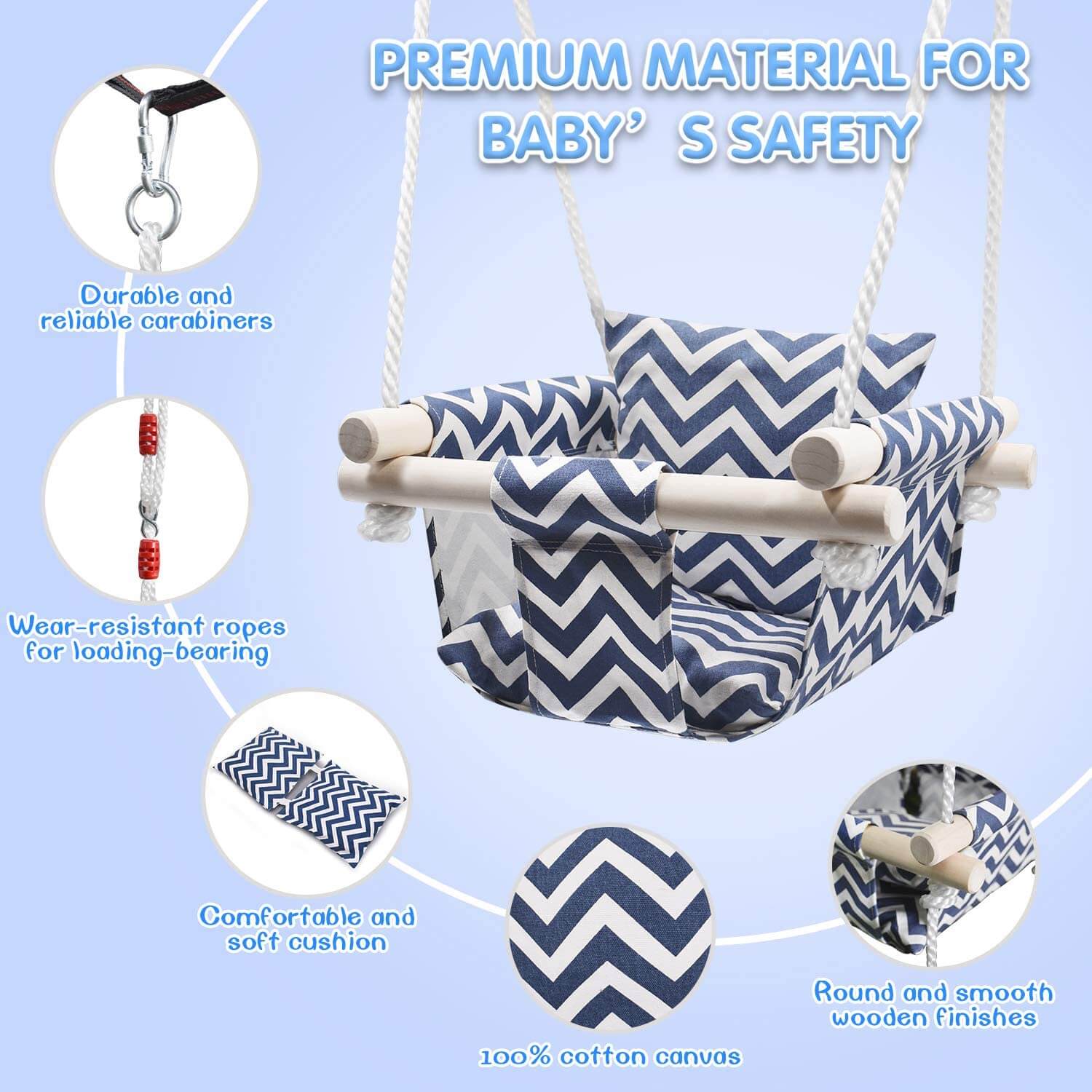 Introduce your baby to outdoor fun with our Safe Baby Swing Seat, crafted from durable, washable canvas and premium wood. Designed for safety and comfort, this baby hanging swing features soft, rounded wood finishes to prevent bumps and a secure, adjustable polyethylene rope system. It's suitable for both indoor and outdoor use, allowing your baby to enjoy nature or share happy moments with you.