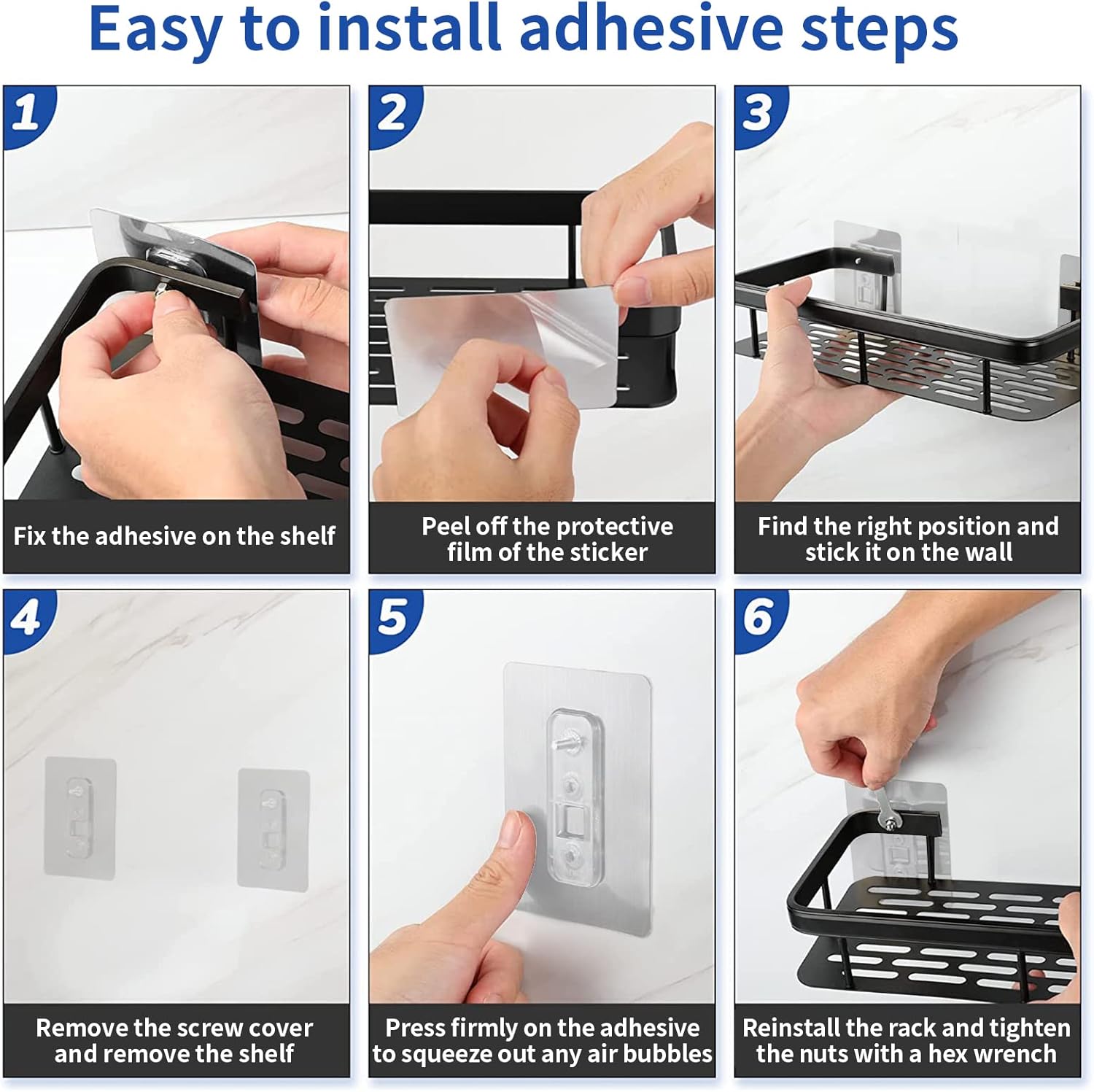 Bathroom Shower Caddy Shelf is equipped with strong adhesive strips for easy, no-drill installation. Protects your walls from damage while offering a secure hold. -
