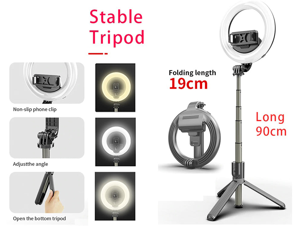 Elevate your selfie game with the Portable Bluetooth Selfie Stick Tripod featuring a built-in ring light. This versatile accessory combines a selfie stick and tripod, ideal for capturing perfect selfies and group shots anywhere.