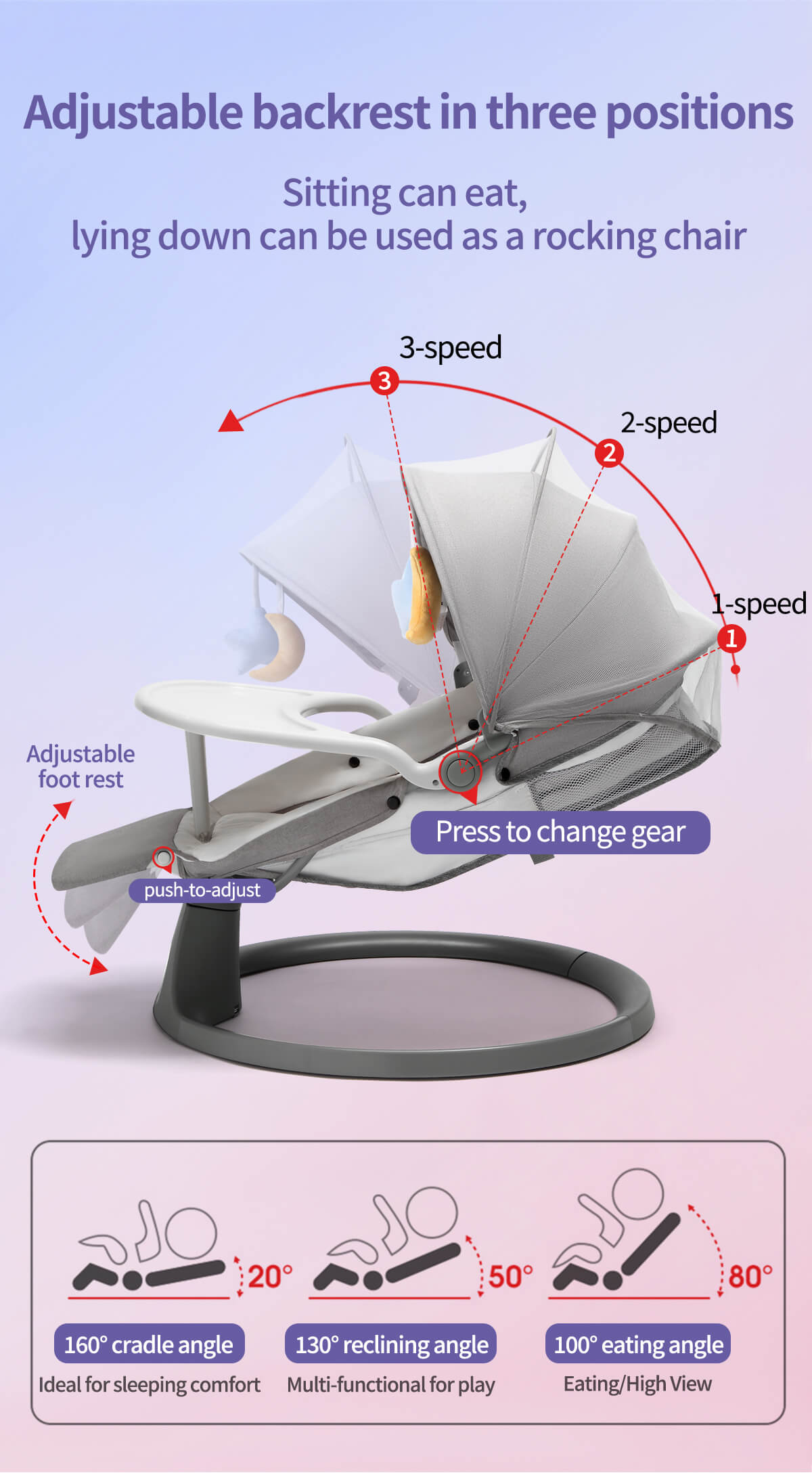 - Versatile Swing Speeds: Customize the motion with five-speed swing options and a three-speed timing setting to match your baby's mood.