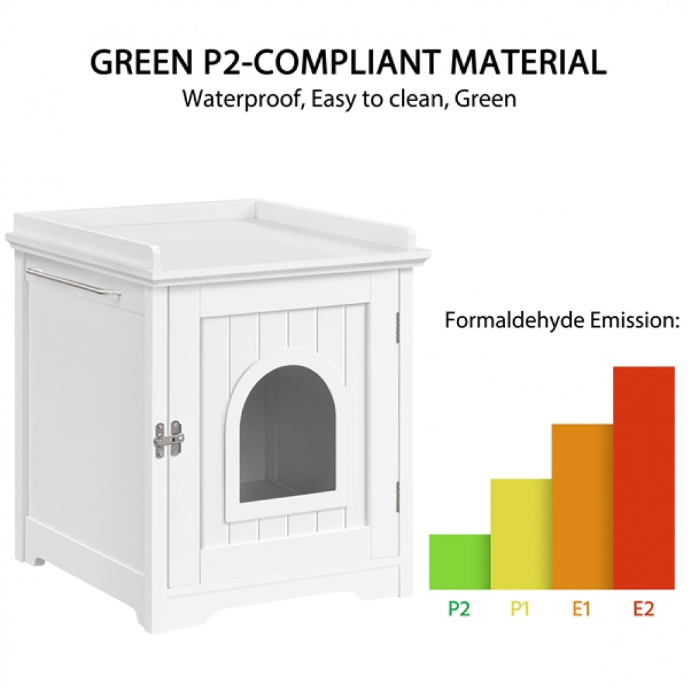 Looking for a quick and easy solution to hide your cat’s litter loo while maximizing space in small apartments without sacrificing style? You don’t want to miss this Cat Litter Box Cabinet. This versatile and innovative furniture not only hides the ugly cat litter box but also offers decent storage or display surface on the top. Constructed of quality CARB P2-compliant MDF and with an interior of L40cmxW50cmxH44.6cm/ L15.7”xW19.6”xH17.6”, it can accommodate most litter boxes for small/medium-sized cats. This cat litter box furniture features several pet-parent-friendly designs like the side towel bar, 7 vent holes on the back, a magnetic door catch and door latch and 4 non-slip rubber pads. Simple assembly is required.