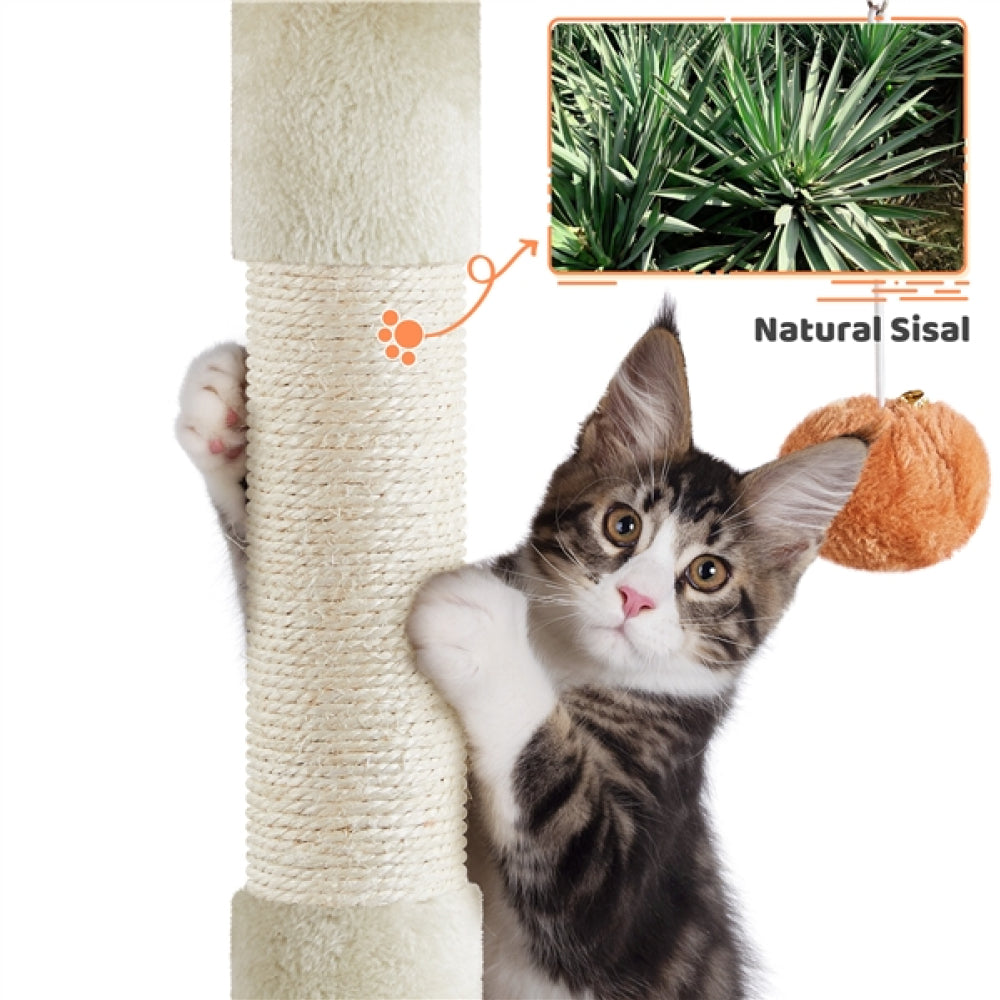 A cat paw? It's actually a CAT TREE! Taking inspiration from a cat's claw, this 65" cat tree features a delightful combination of beige, orange, and gray colors, along with cute cat claw-shaped details for an adorable and vibrant look. This cat tree offers various spots for relaxation, including a sturdy base shaped like a cat paw, multiple scratching posts, two comfortable perches for viewing from above, two cozy condos, and three extended platforms for lounging. The sisal-coiled scratching posts flawlessly mimic tree bark's texture and maintain your pet's claws' scratching and health. This cat tree fulfills your cat's essential needs, from lounging and napping to playing and scratching—an ideal addition to any household with a love for cats.
