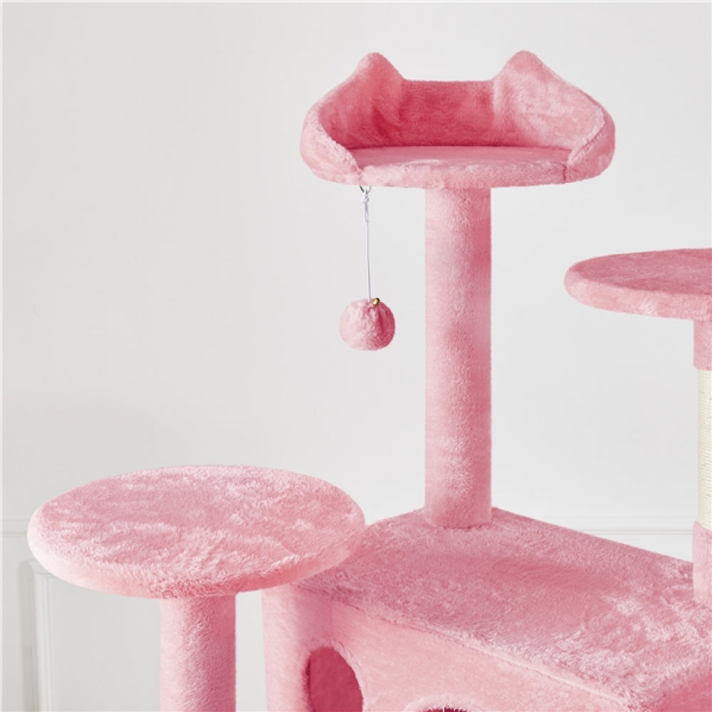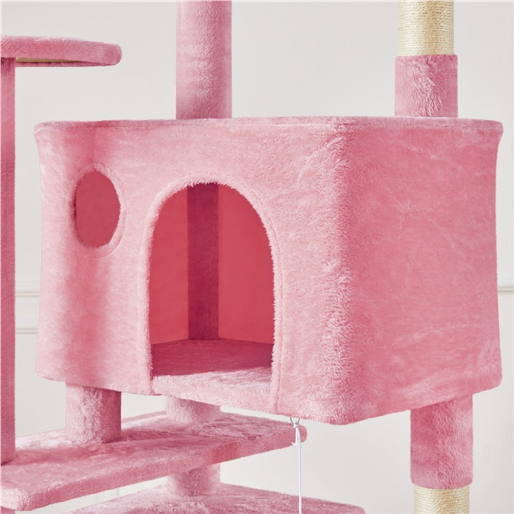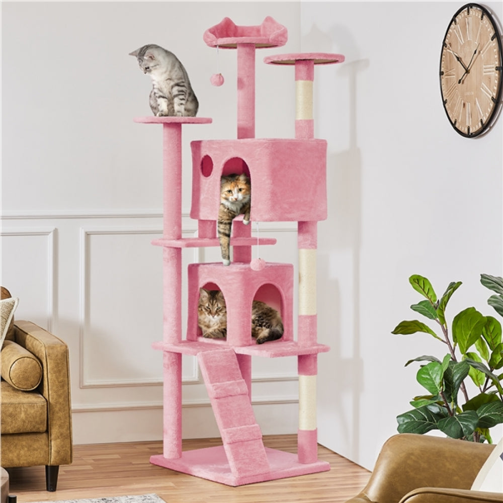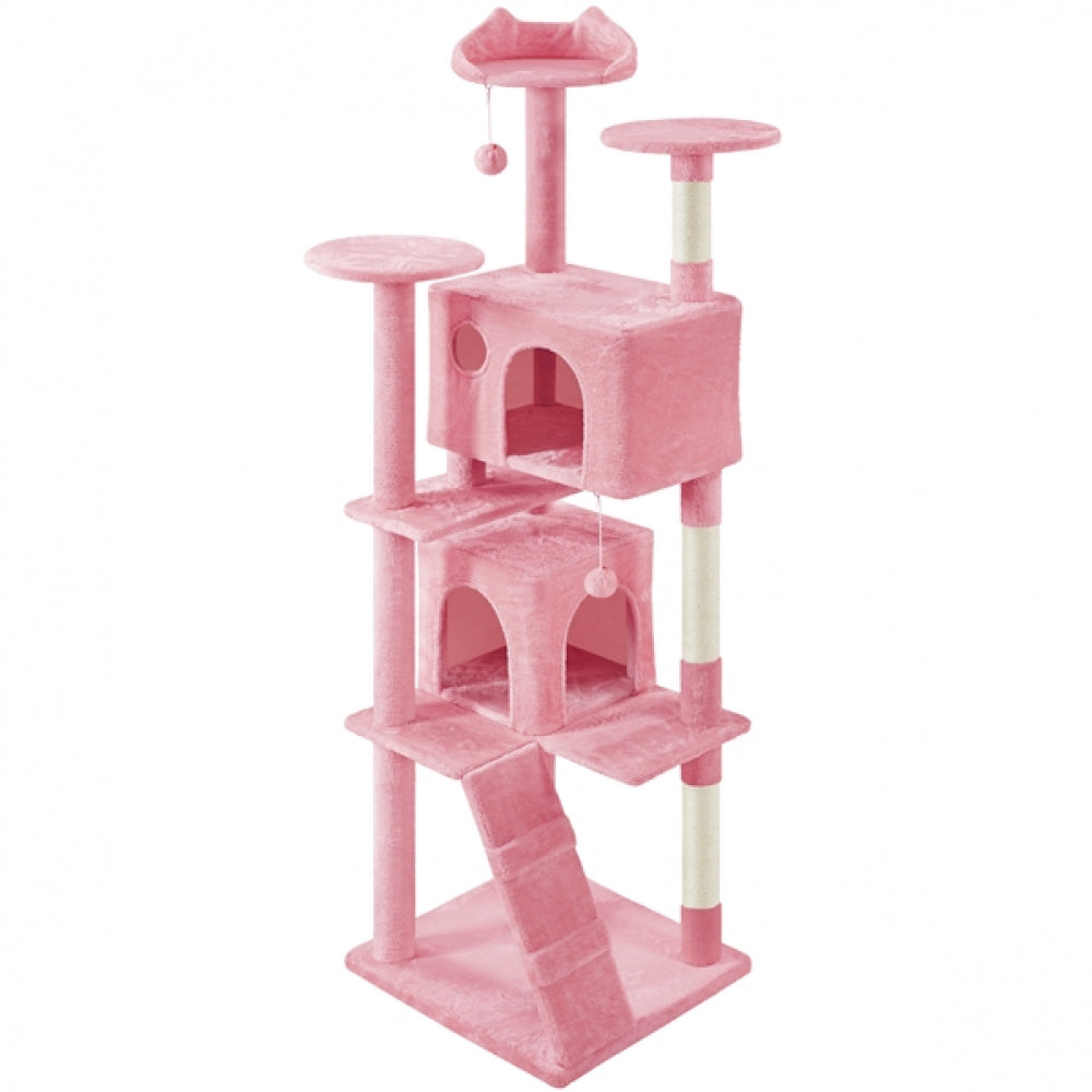 Specifications: Color: Pink Materials: Manufactured Wood, Plush, Sisal Assembled Dimensions: 55 cm L × 59.5 cm W × 202.5 cm H Baseboard: 55 cm L × 59.5 cm W Big Condo: 55.5 cm L × 35 cm W × 35 cm H ; Entrance: 20 cm W × 25 cm H; Window: 10 cm Dia. Small Condo: 35 cm L × 35 cm W × 35 cm H; Entrance: 20 cm W × 25 cm H Round Platform Dia.: 35 cm Cat-Ear-Shaped Perch: 37.5 cm Ladder: 56 cm L × 18.5 cm W Maximum Weight Capacity: Top Platform:5 kg / 11 lb Big Condo: 15 kg / 33 lb Small Condo: 10 kg / 22 lb Item Weight: 19.5 kg / 43 lb Shipping Weight: 20.5 kg / 45.2 lb