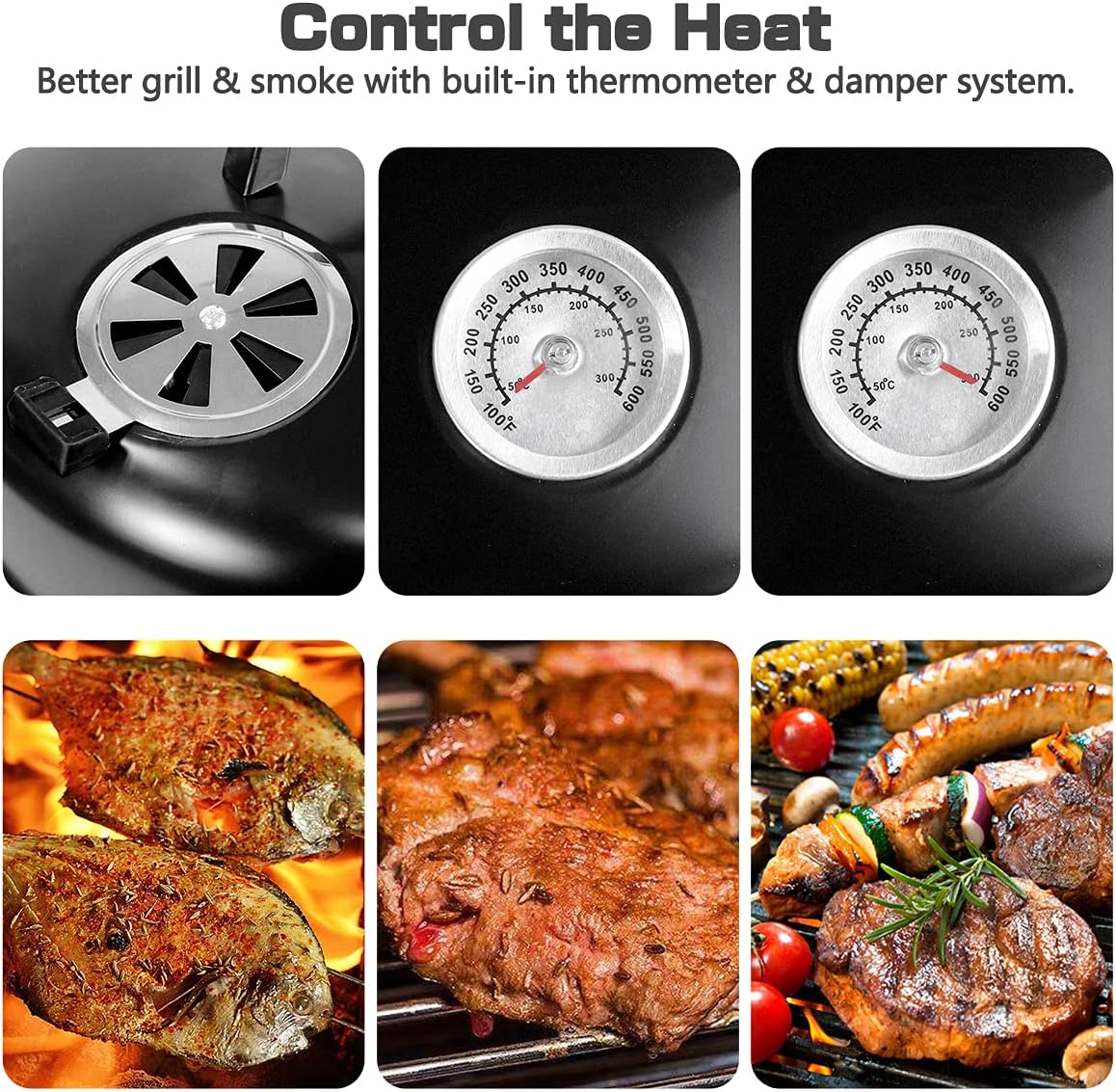 - Built-in damper system and thermometer for easy heat control, eliminating the need for frequent removal to check food or add fuel. The smoker also includes two convenient doors.