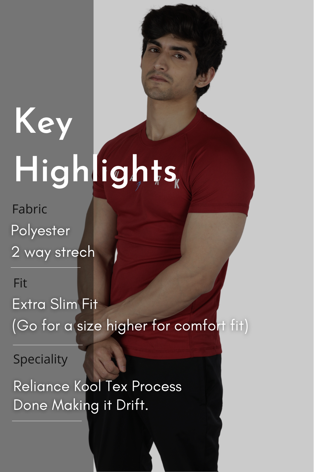 Add a pop of color to your wardrobe with the Maroon Snugg (Extra Slim) Fit checks T-shirt. Featuring a fitted extra slim fit, this t-shirt offers a sleek, modern look that flatters your body shape. The raglan sleeves highlight your traps and shoulders, providing a defined, athletic silhouette. Thanks to the side panels, this shirt allows for complete flexibility and movement, making it ideal for both casual outings and active wear. The rich maroon color offers a bold, sophisticated look that’s perfect for making a statement. Whether you're lifting at the gym or pairing it with your favorite jeans, this t-shirt is a stylish, versatile option for any occasion.