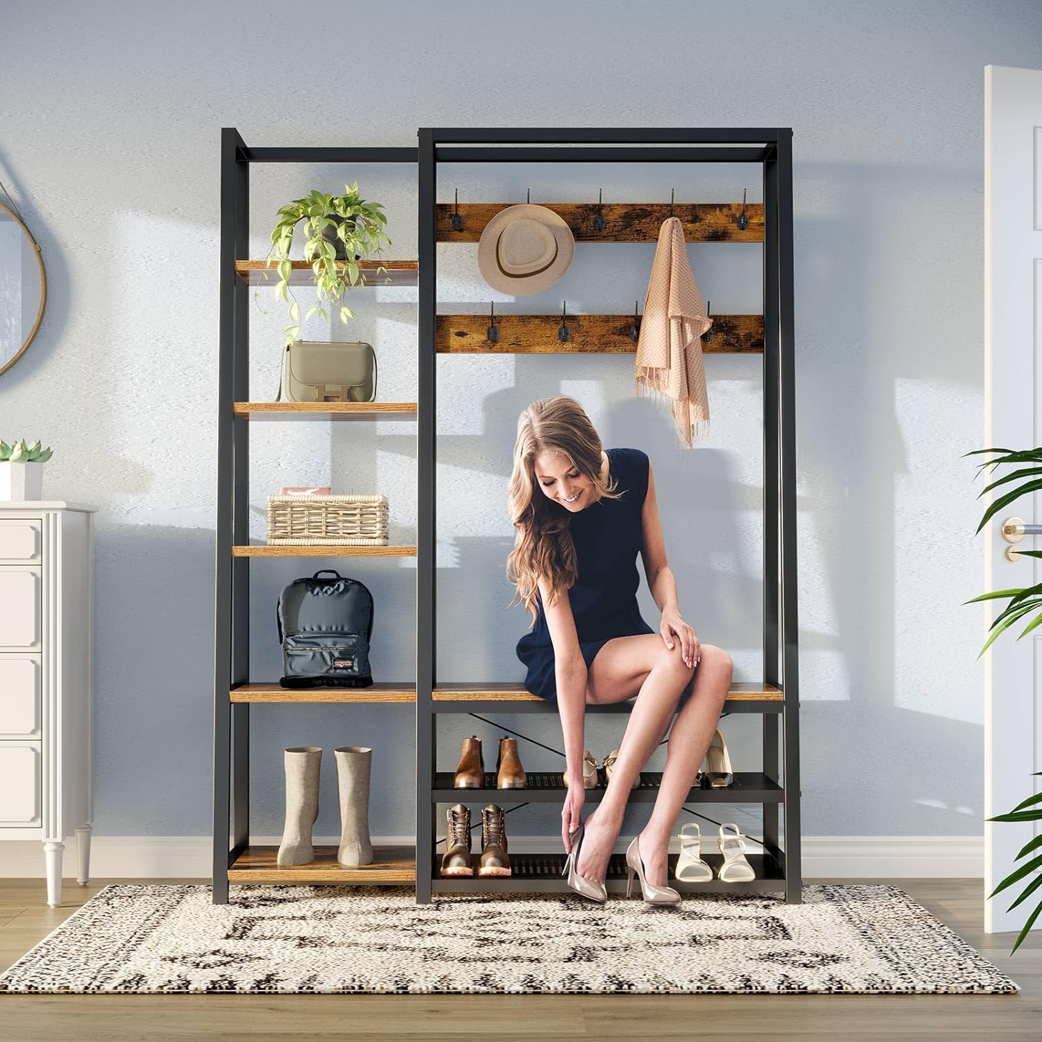 Coat Hanger & Coat Rack & 2 Tier Shoe Bench & 5 Tier Organizer Shelves (All in one)