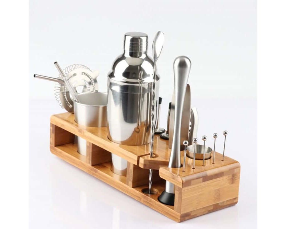 - Set includes 23pcs necessary for mixing drinks, comes with a wood stand with slots for convenient storage.