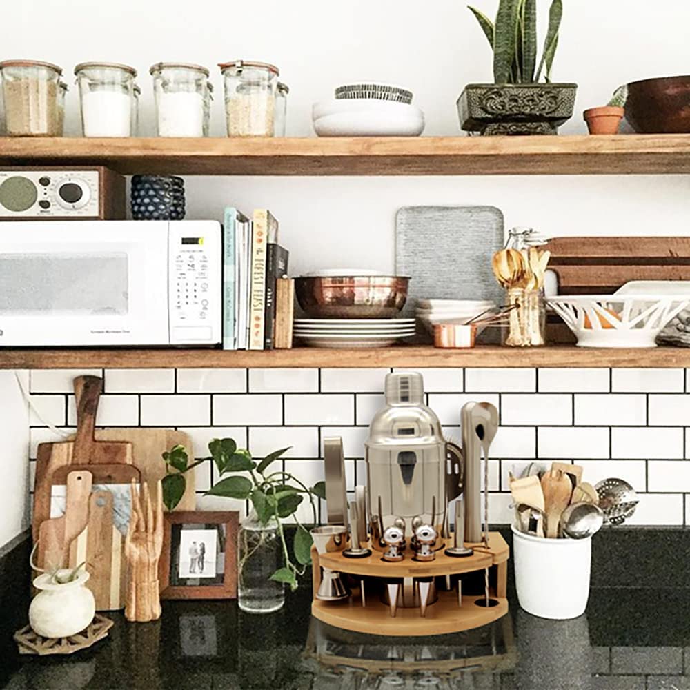 -Easy to Store - Stylish Bamboo Stan: The unique semicircular bamboo stand makes the bar table very neat and beautiful. The drawers and cabinets in the kitchen are no longer chaotic. The accessories are made of the highest quality SS304 stainless steel alloy. The surface is finely polished to prevent rust and easy cleaning. All accessories can be washed in the dishwasher to make life easier and faster.