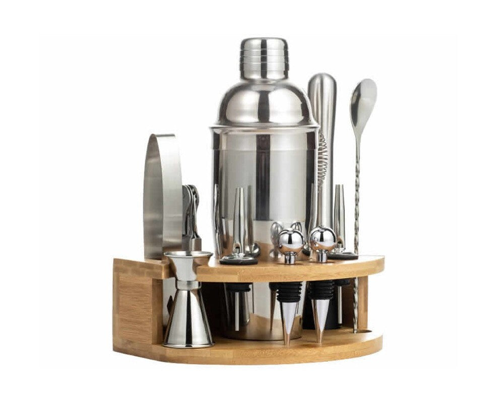 -Complete Cocktail Kit : The cocktail shaker set is the best tool for bartenders to make a wide variety of party cocktail or bar mixed drink. Include 25 oz Cocktail Shaker, 15/30ml Double Jigger, Strainer, Ice Tongs, Muddler, Spoon, Liquor Pourers*2, Bottle Stopper*2, Wine Opener, Bamboo Stand, Cocktail Recipes Booklet.