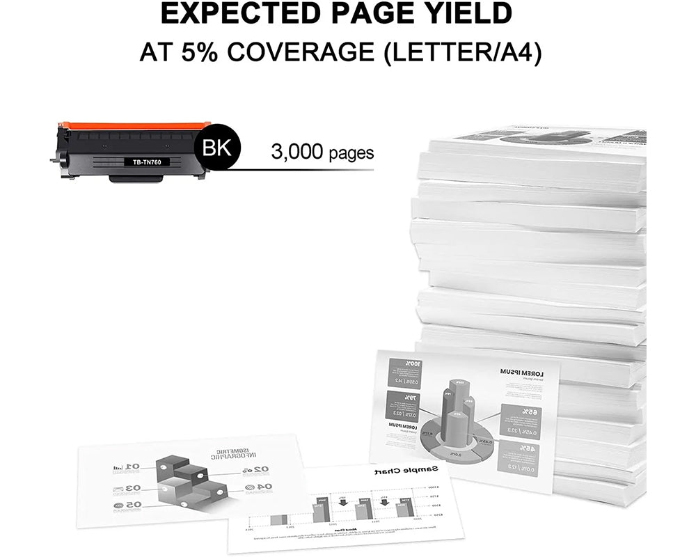- High Page Yield: Each TN760 toner cartridge offers an impressive yield of 3,000 pages (at 5% coverage), ensuring long-lasting performance and fewer replacements.