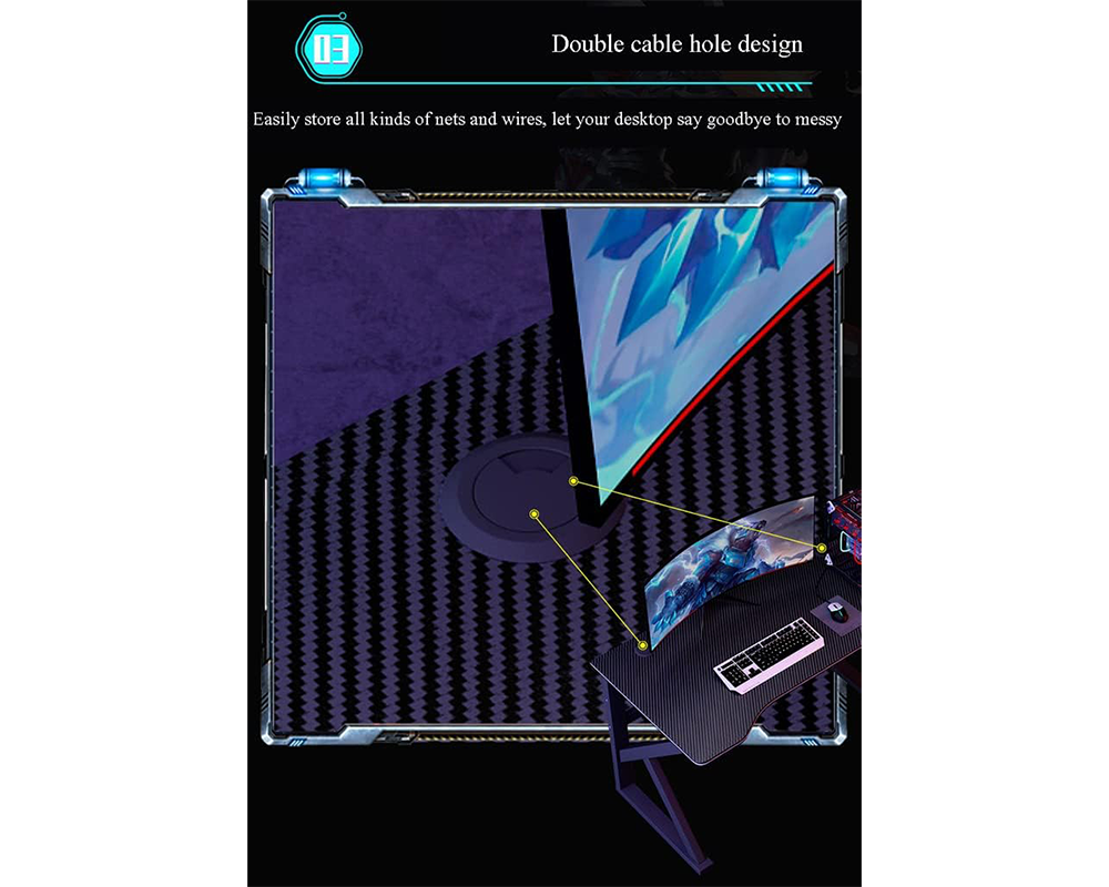 Efficient Cable Management: Equipped with 2 cable management eyelets, this desk keeps your workspace organized and clutter-free, allowing you to focus on your game or work.