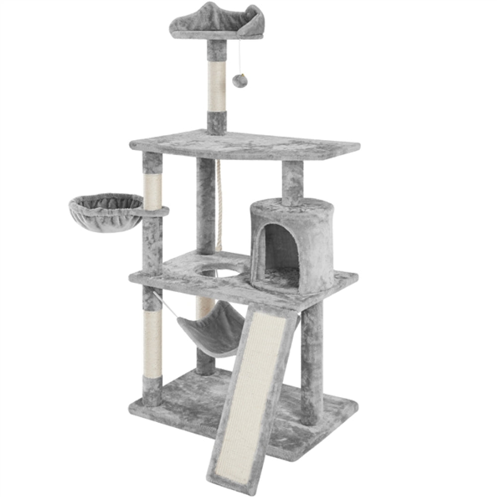 Are you looking for a comfortable cradle for your cats? Why not send this multifunctional cat tree to your cat? This large cat tree is made of particleboard, plush, sisal ropes, and metal. Our large cat tower has a pretty appearance and a reasonable layout. It can fully meet your cats' needs for playing and sleeping and exercising. If you have more than one cat, this large cat house is an ideal choice. It has multiple levels and layouts and functions. Simple assembly is required and a detailed manual is included. Do not miss this quality cat tree!