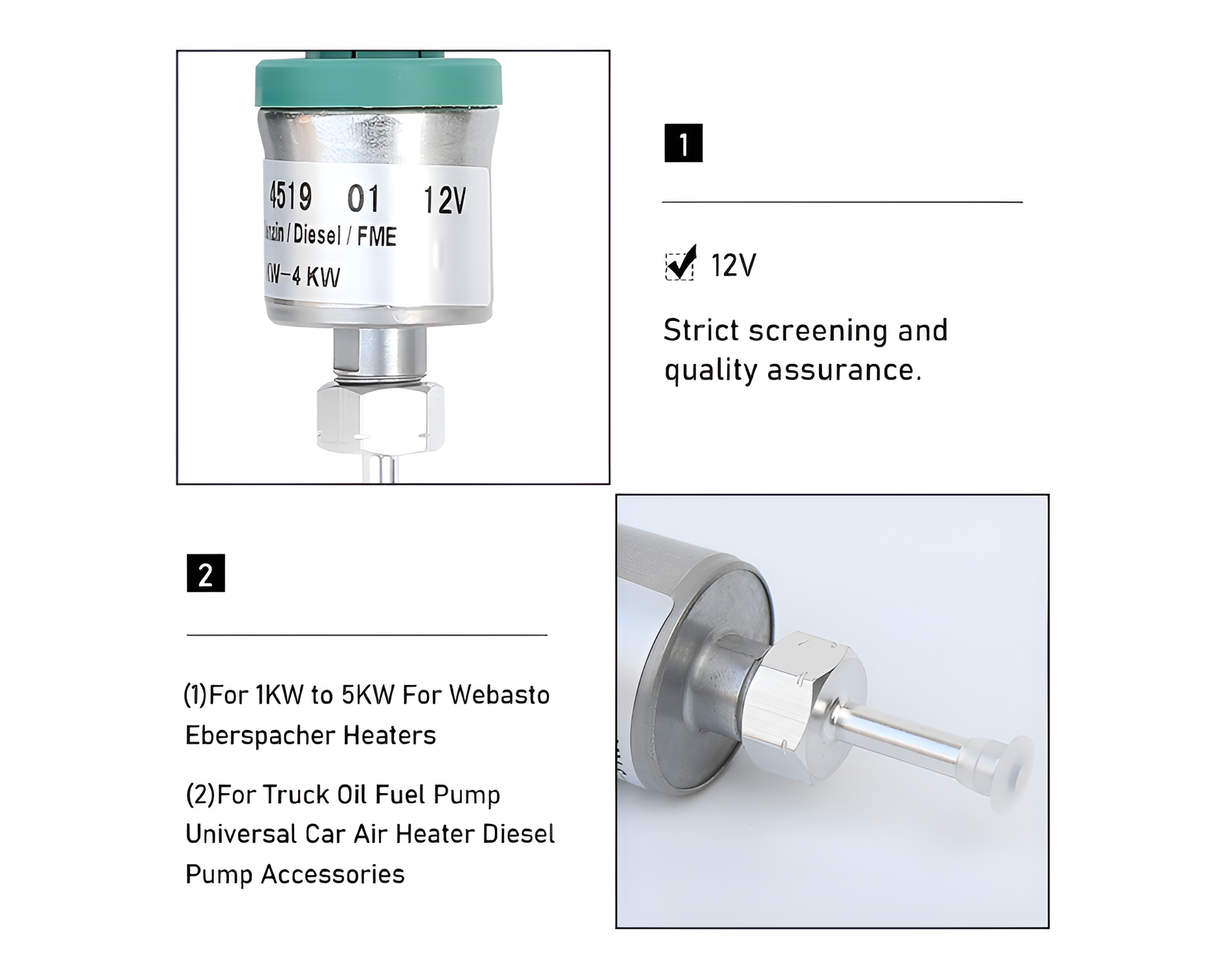 - High Compatibility: Designed for universal fit, this Car Diesel Heater Oil Fuel Pump works perfectly with parking heater models D2, D4, D5, and 2KW–5KW Chinese car diesel heaters.