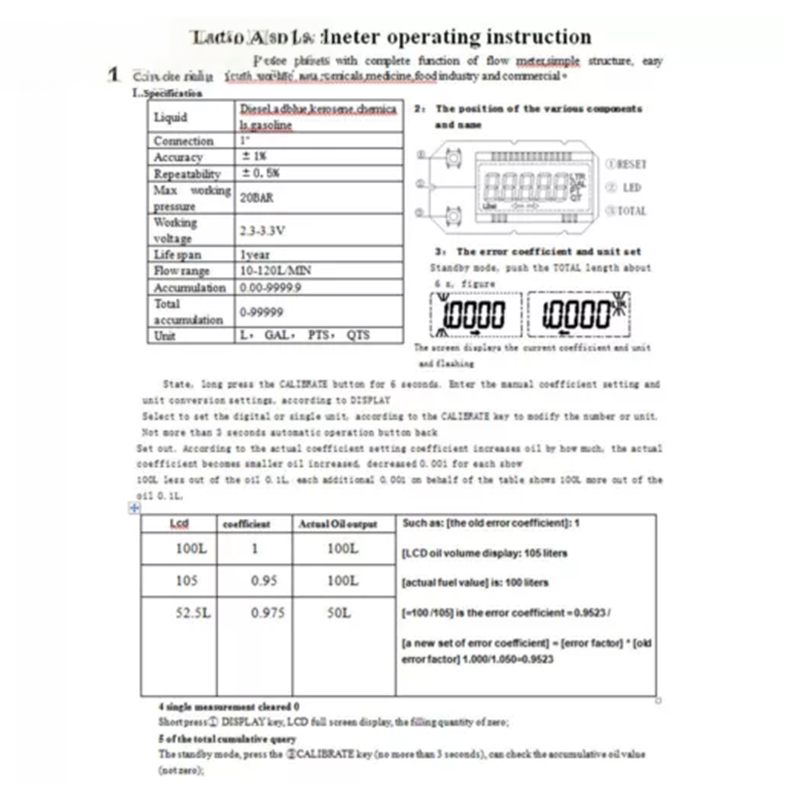 This digital display flow meter features an intuitive and clear display, offering high reliability and measurement accuracy of 1% for both instantaneous and cumulative flow. It is lightweight, easy to replace, and has a compact design, making it convenient for various applications. Powered by 2 x AAA batteries, it provides readings in liters, with the option to change the unit using the "DISPLAY" button.