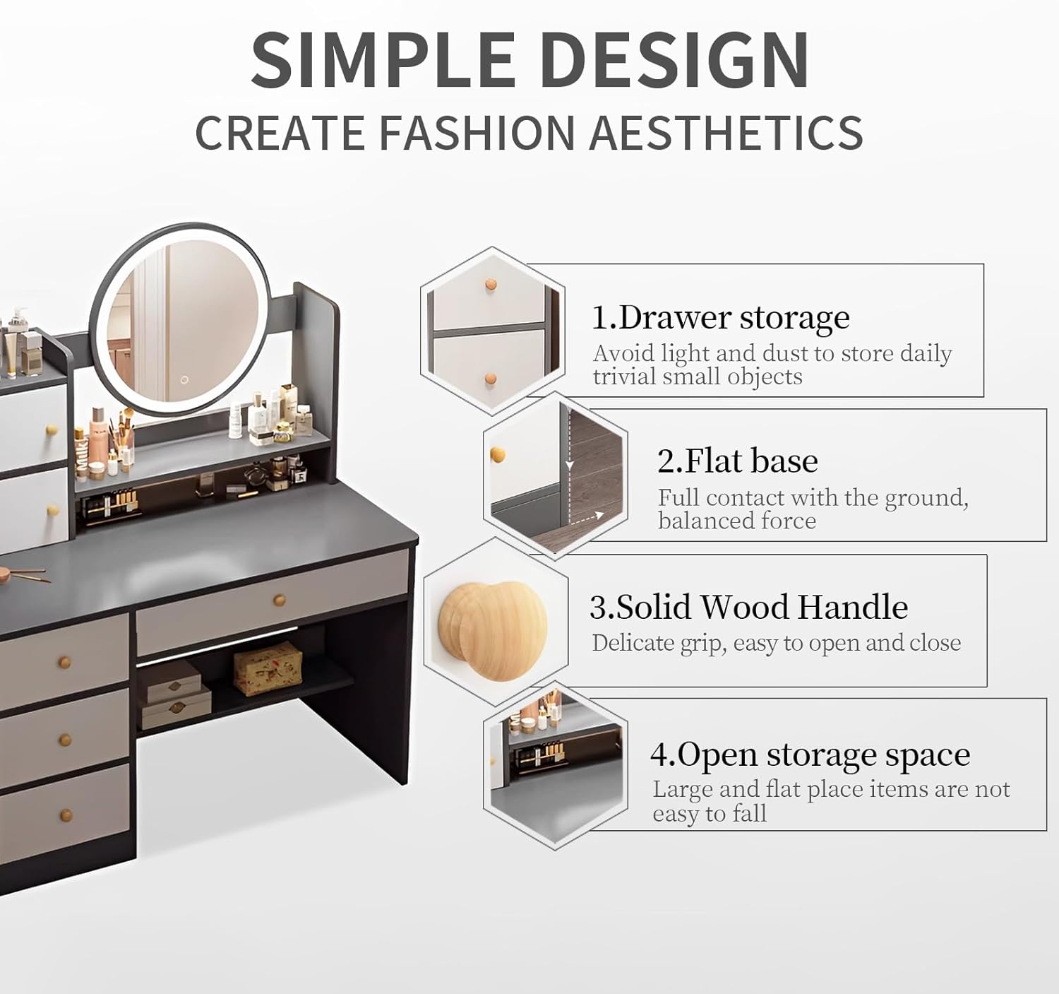 - Touch Screen LED Mirror – The Makeup Vanity Dressing Table includes a high-definition mirror with 3 lighting modes for flawless makeup.