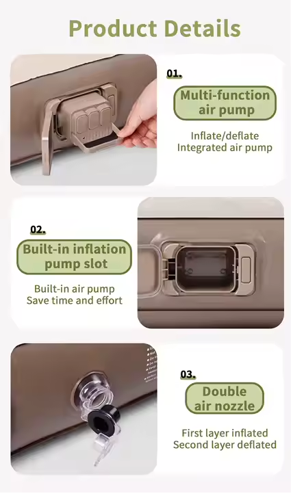 This Outdoor Inflatable Single Airbed Mattress is designed to provide reliable comfort and efficient setup for camping, travel, and temporary home use. Featuring a built-in high-efficiency pump and a thickened structure, it offers a practical and comfortable sleeping solution in a wide range of environments.