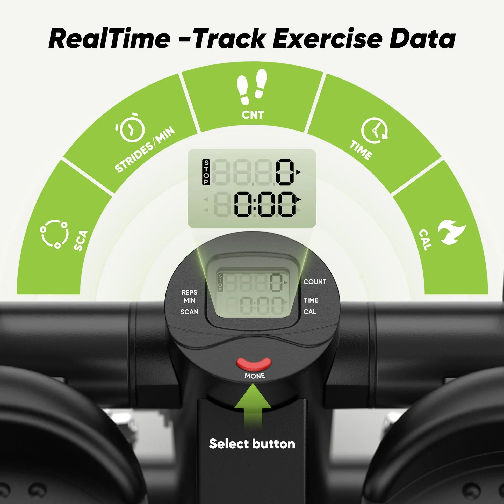 - Display: LED monitor (steps, time, calories, strides/min)
