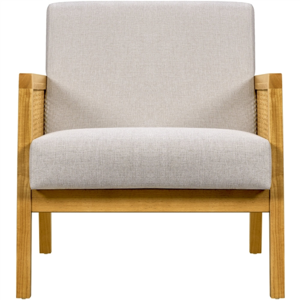 Adds a beachy look to your sitting area with this upholstered armchair. Its rectangular, cane paneled arms, splayed legs and cozy fabric upholstery add a stylish and elegant touch to your space. It's crafted with a solid wood frame and sits on tapered rubberwood legs in a natural hue. A slanted backrest and extra-wide cushioned seat along with long armrests provide ample comfort and support in any seating position. This chair is upholstered in polyester fabric or polyester boucle that is breathable and close to the skin. The high-density foam-filled seat is supported by four sinuous springs, extending its service time. A simple design meets a warm, neutral color palette, making it ideal for living rooms, bedrooms, home offices, sunrooms, lounges, balconies and more.