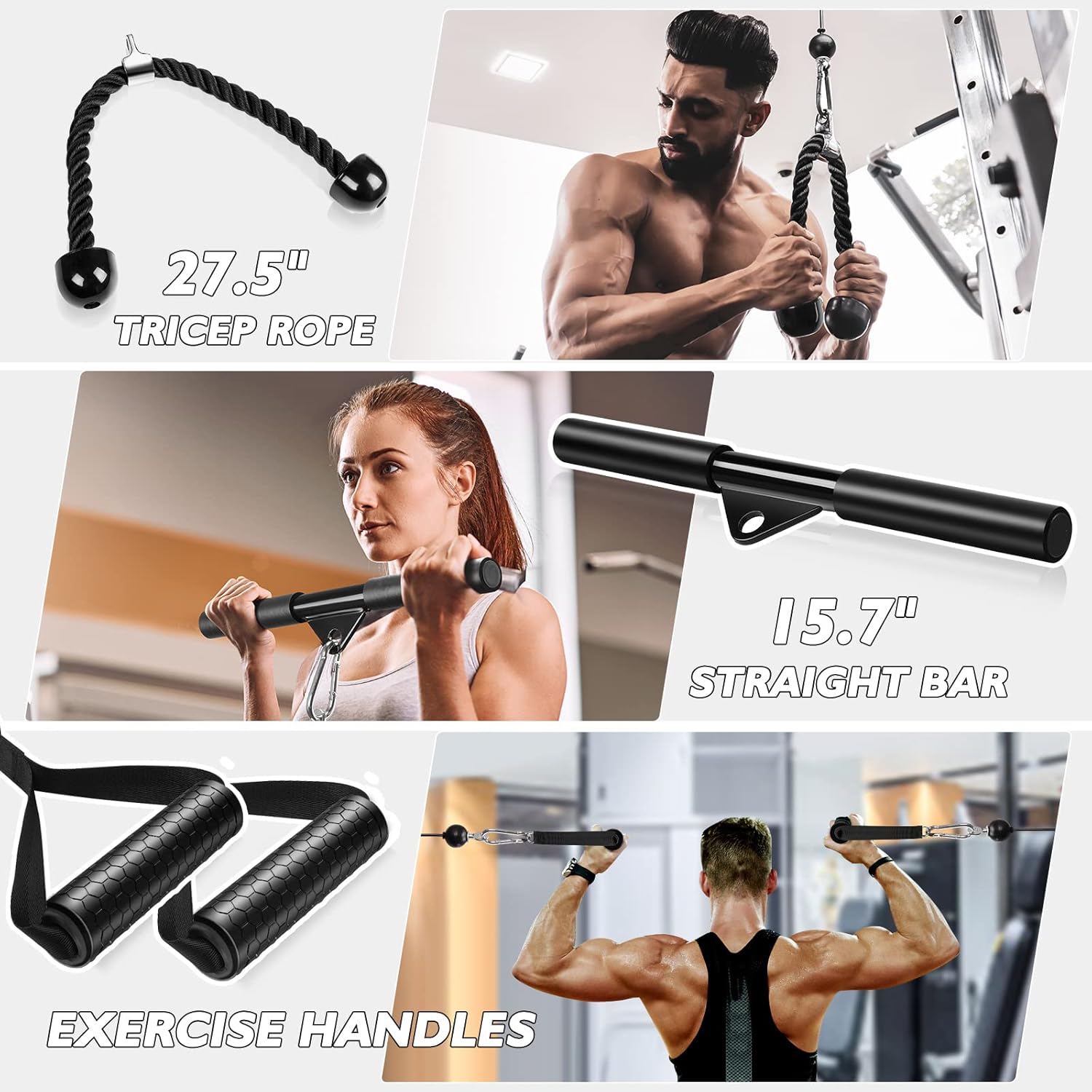 - This Fitness Pulley System features an upgraded dual-pulley design with multiple cable machine accessories, allowing the Lat Pulley System to support a wide range of exercises including lat pull-downs, triceps pull-downs, biceps curls, rows, fly movements, and functional training