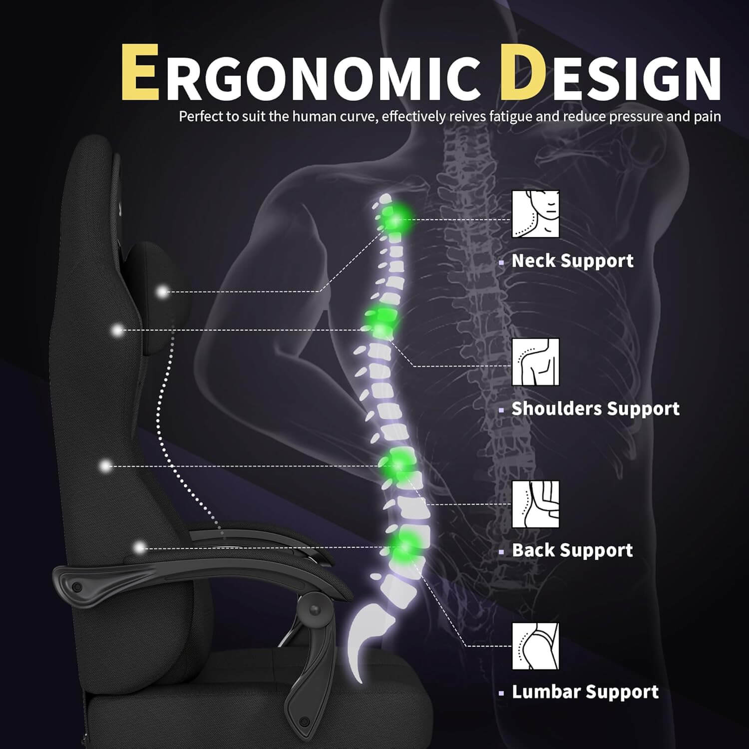 Additional features include a retractable footrest, adjustable headrest, and lumbar support to fully meet your needs. The ergonomic design, crafted from durable PU leather, includes a removable headrest and lumbar support, ensuring proper alignment and support for your back and neck. The chair's recline function allows it to be locked at any angle between 90-150 degrees, providing a comfortable and relaxing experience whether you're working or gaming.