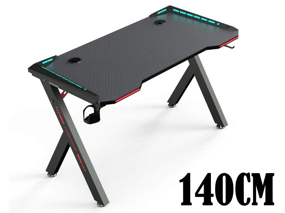 Gaming Desk Table 140cm with RGB LED Lights, Cup Holder, Headphone Hook, and Sturdy R-Shape Frame
