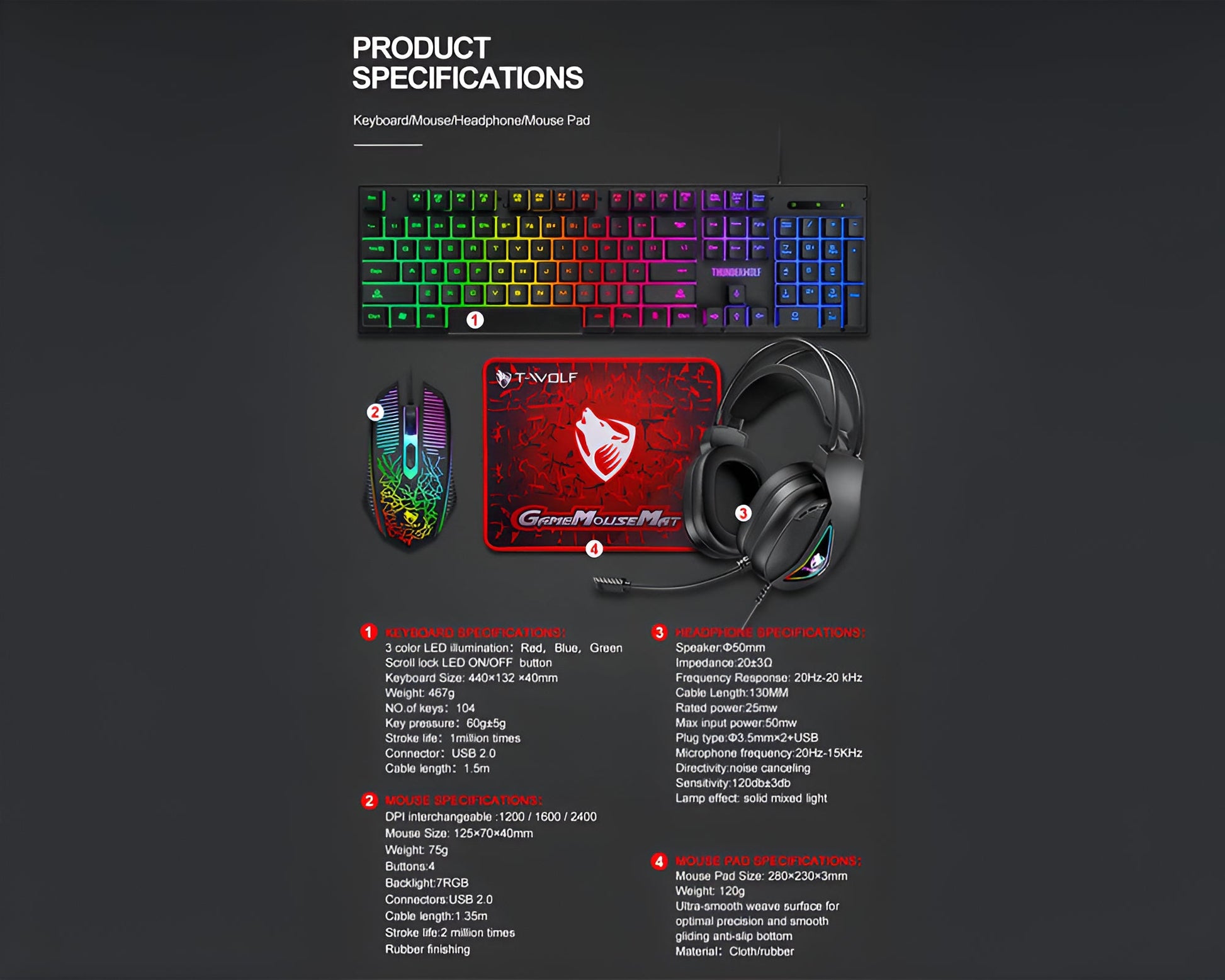 - Mouse: 3 DPI modes, 7-color lighting, ergonomic grip