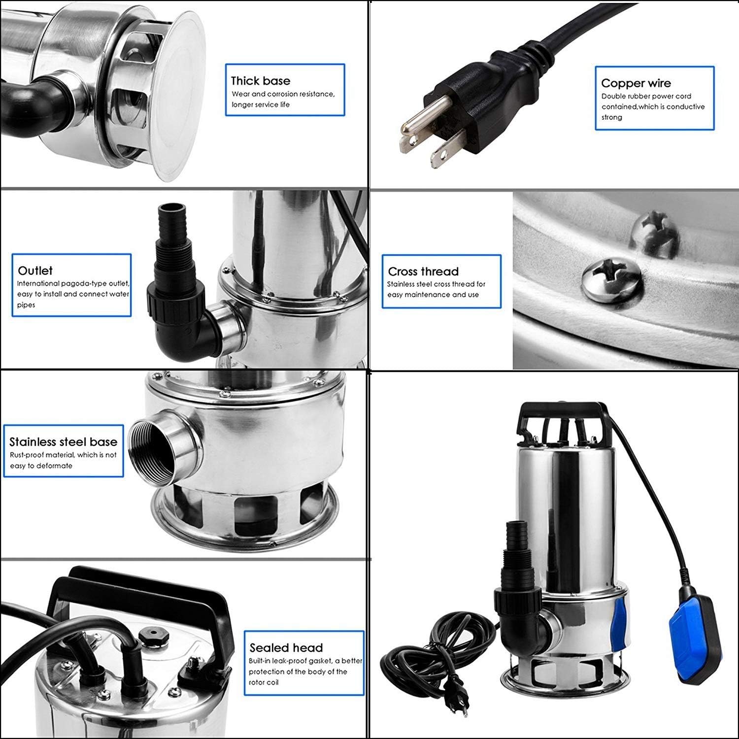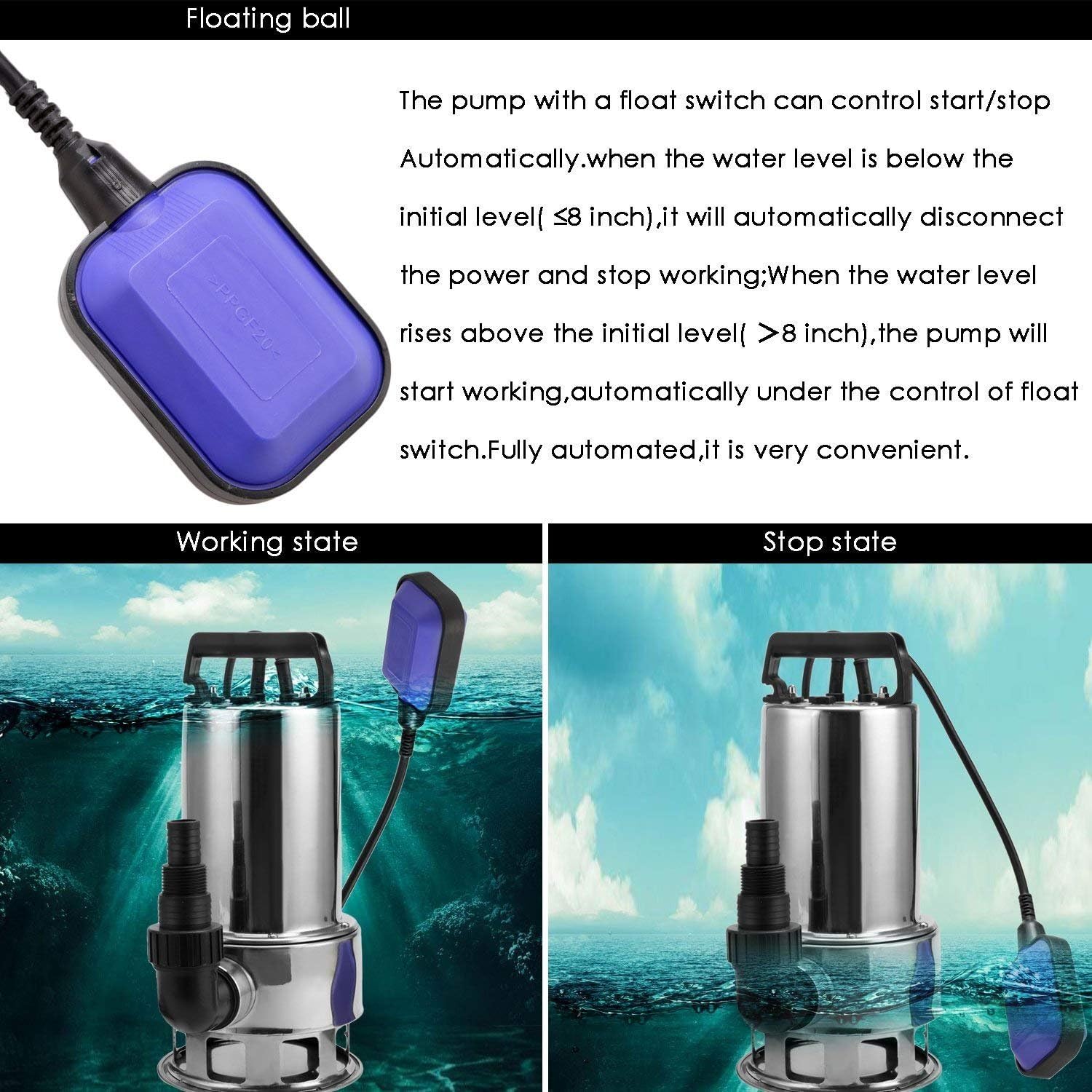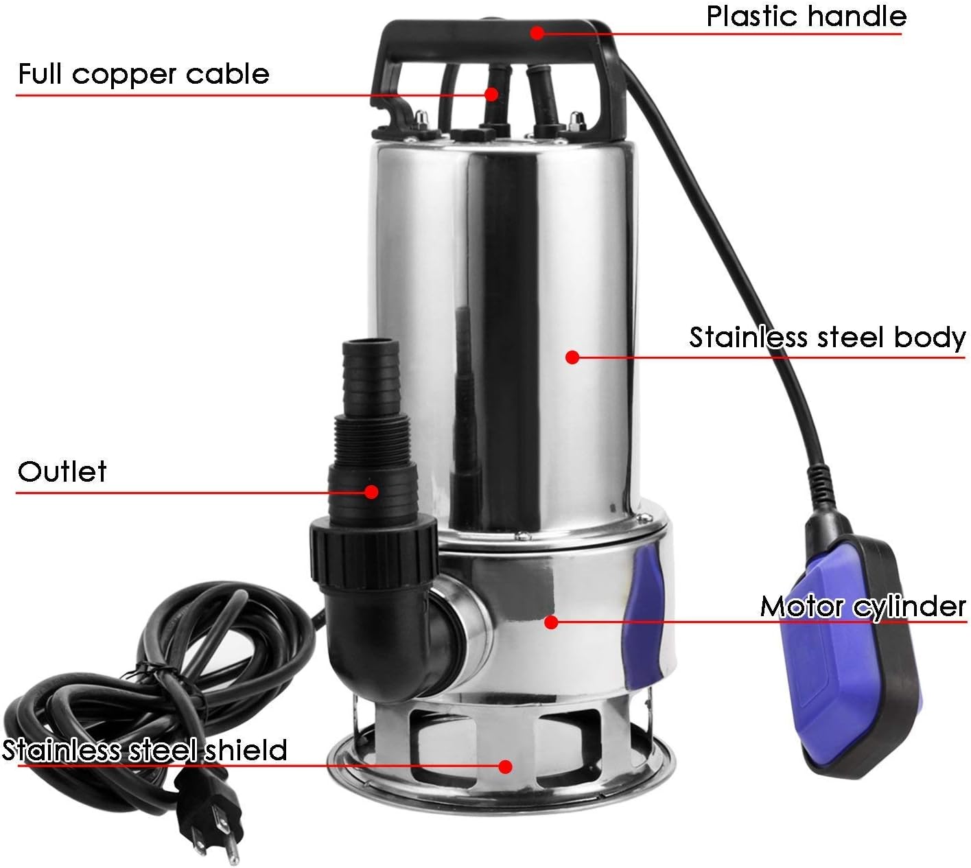 - Automatic Float Switch: The Submersible Water Pump features an adjustable float switch that automatically starts or stops the pump to prevent dry running.