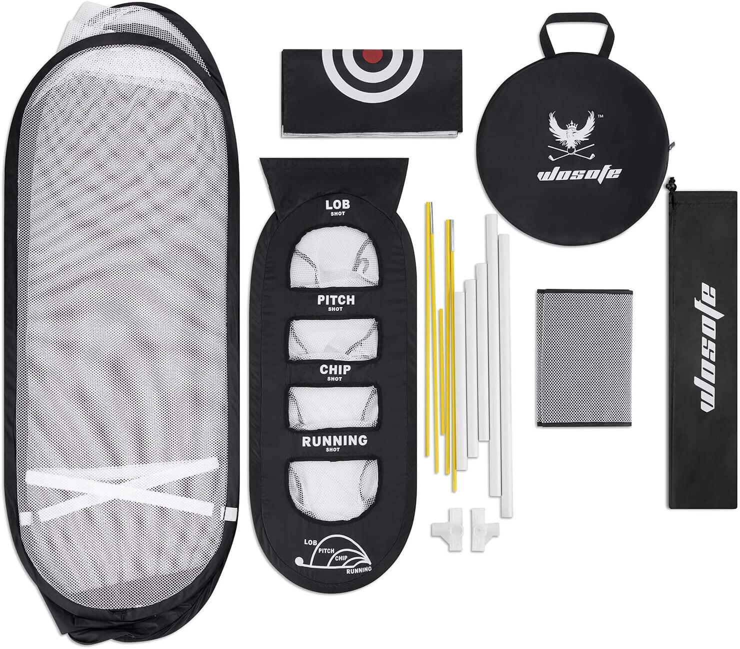 - Includes two golf targets, a ball recycling net, 6 foam practice balls, and 2 white golf balls