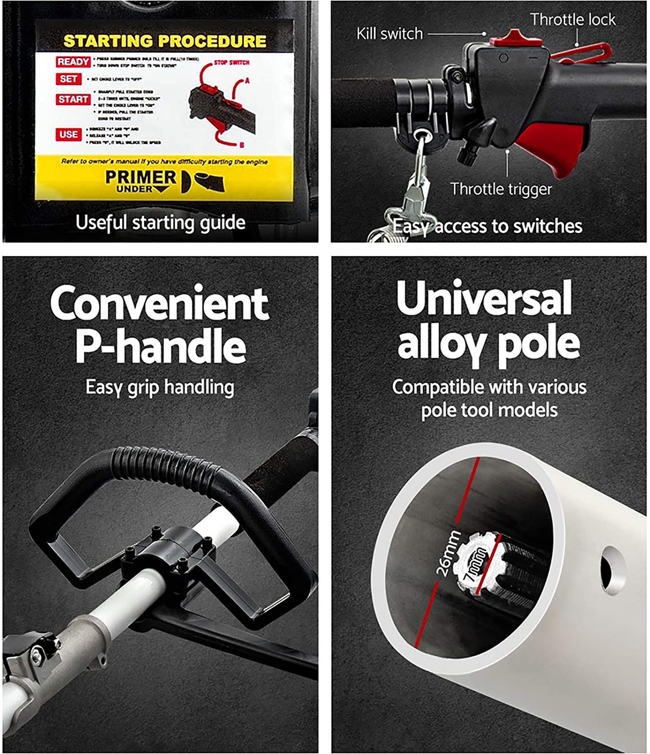 Equipped with a 62CC 2-stroke commercial engine, delivering 3.4hp (4.1 peak) of cutting power. With an idle speed of 3300RPM and a maximum speed of 11,000 RPM, it makes quick work of any task. -