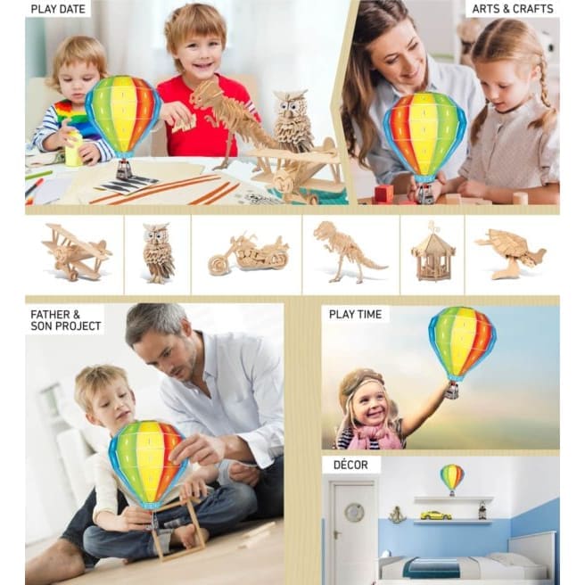 This 113 piece Colourful Hot Air Balloon pre-coloured wood craft construction kit is a fun & educational DIY 3D puzzle to build & paint or keep in natural wood.