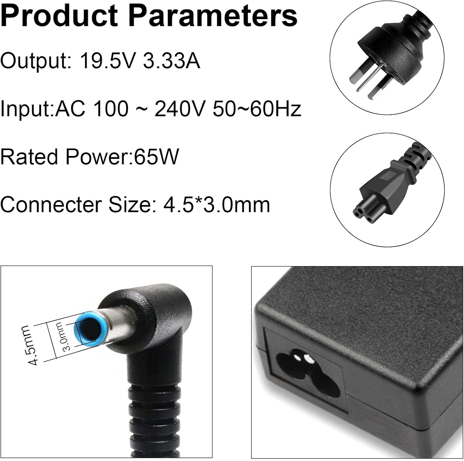 Power Specs: Output Max: 19.5V 3.33A (65W), also compatible with 19.5V 2.30A (45W). Input Voltage: 230V. This HP laptop charger features a 4.5 x 3.0mm Blue Tip for optimal compatibility and performance.