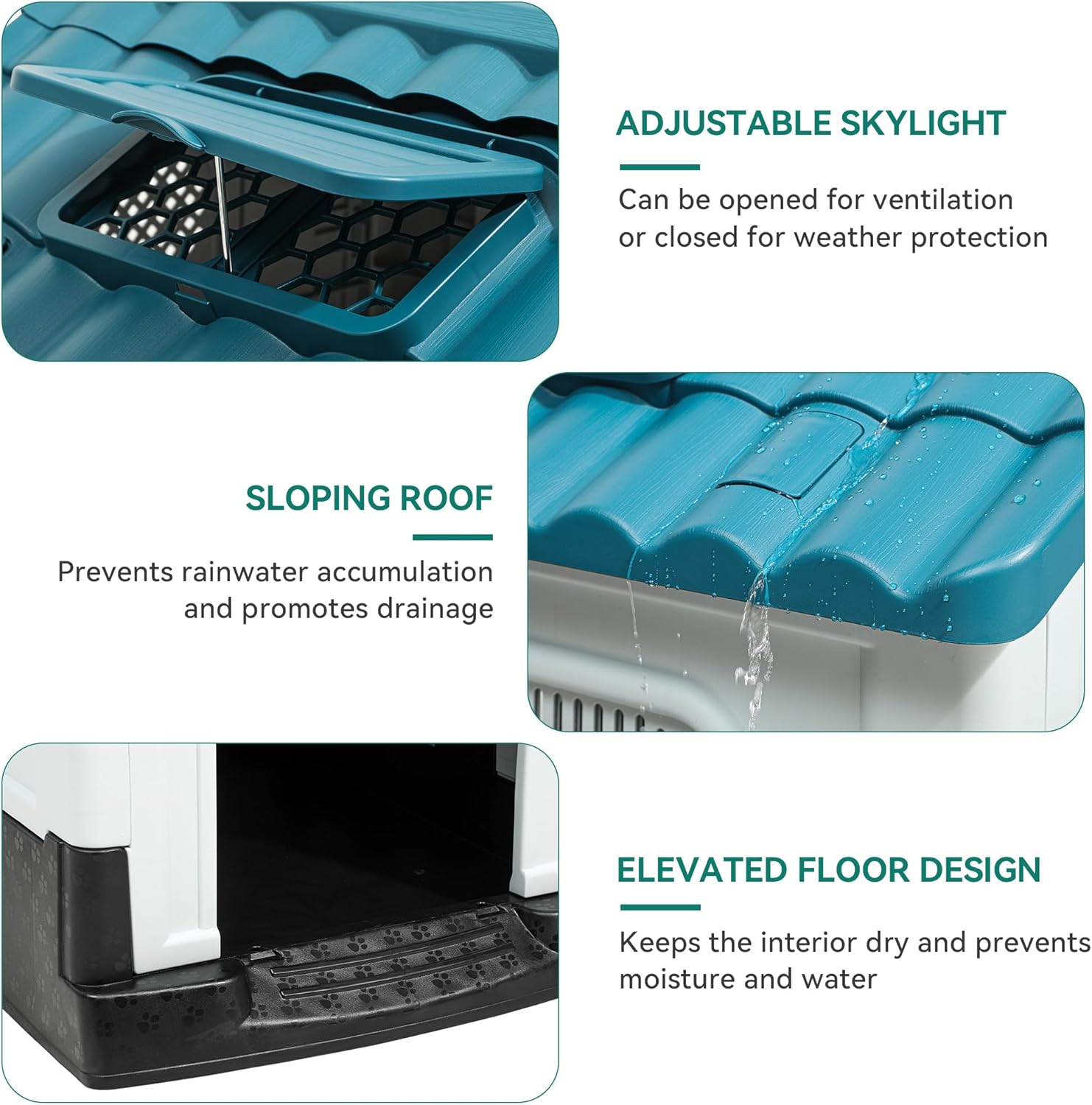 Durable & Strong: Constructed from thick, high-quality polypropylene (PP) material, this dog house is corrosion-resistant and designed to endure harsh weather. The sturdy structure, secured with snaps and screws, can even support an adult sitting on the roof. Its detachable base and roof make cleaning and maintenance easy.