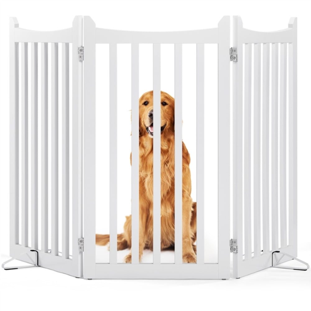 Constructed from a sturdy CARB P2-compliant MDF structure, this three-panel wooden pet gate keeps your dog, puppy, or other pets contained when you are not around. It not only ensures the safety of your pets but also adds a decorative and attractive element to your home. You can adjust the width of the gate to block any entry points effectively. The wooden fence consists of three panels connected with solid hinges, allowing it to be folded into different configurations, such as an I/Z/U shape. The gate also features protective footpads and EVA foam to prevent scratching and stabilize uneven floors. It is suitable for doorways, entryways, halls, bedrooms, and staircases.