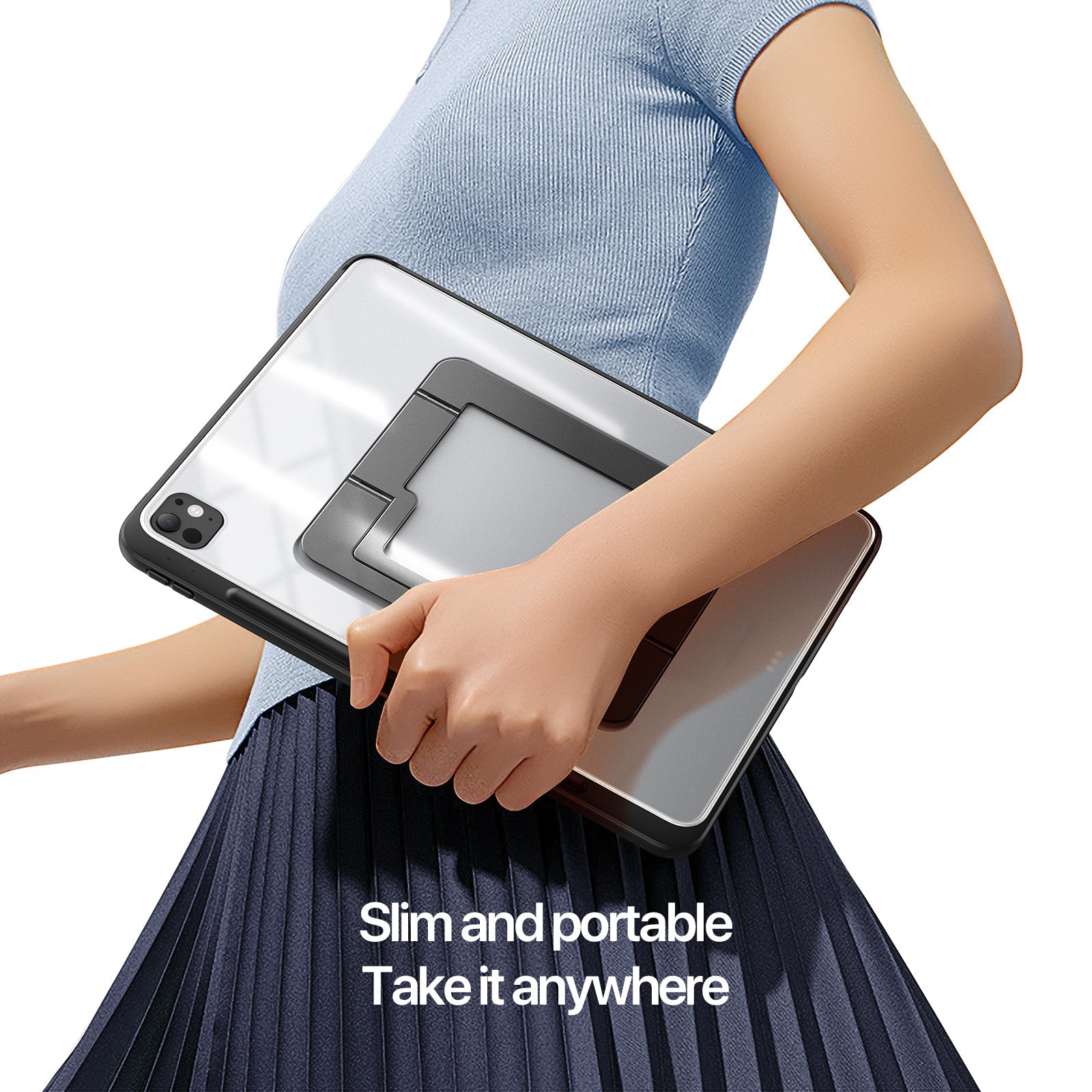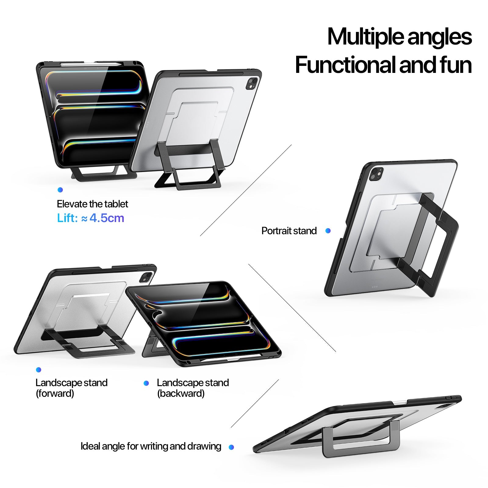 The integrated stand design allows multiple viewing angles for typing, drawing, reading, and watching videos. Switch effortlessly between landscape and portrait modes for maximum productivity.