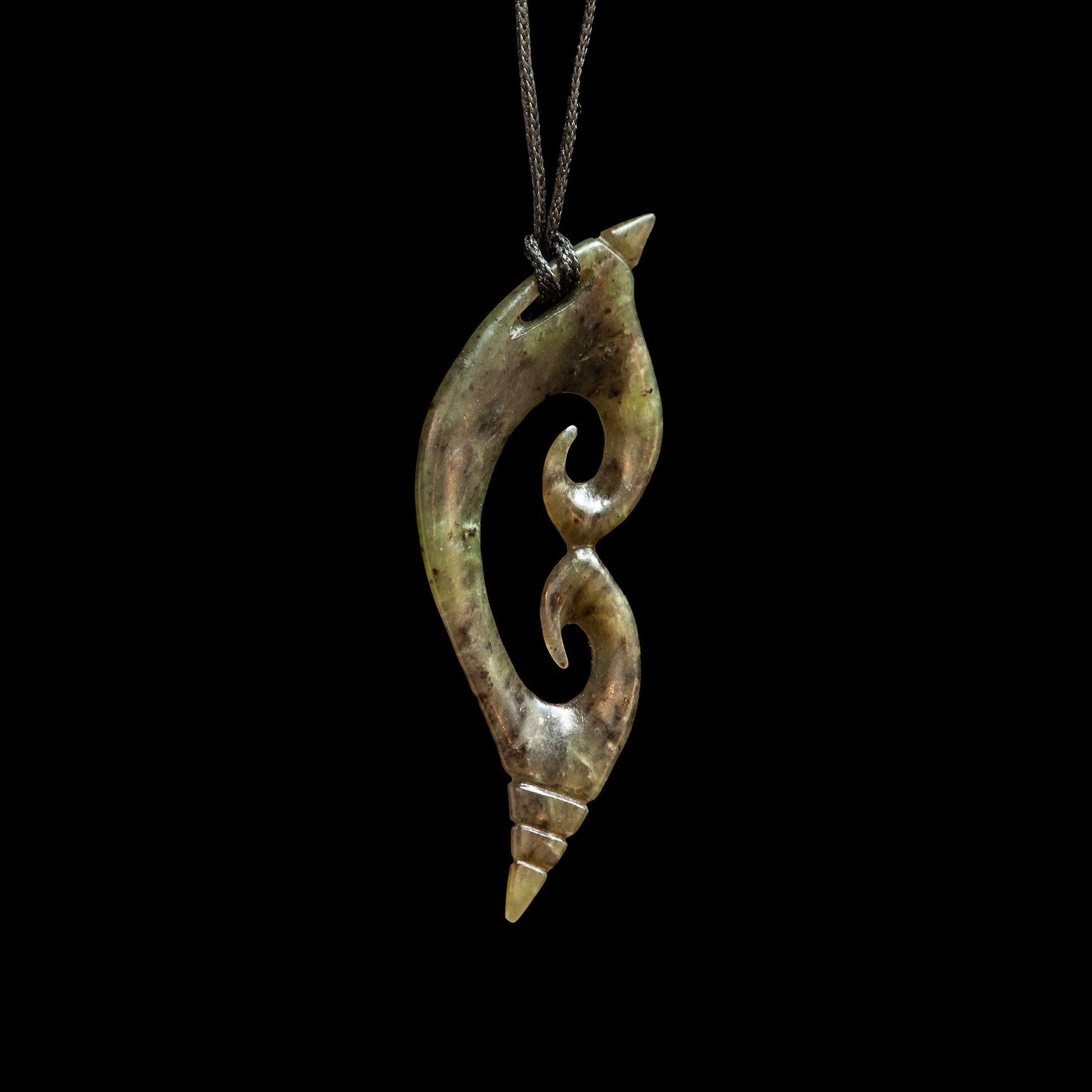 It includes an adjustable waxed braid cord, a traditional-style woven presentation pouch and a detailed description of the meaning of the carving.